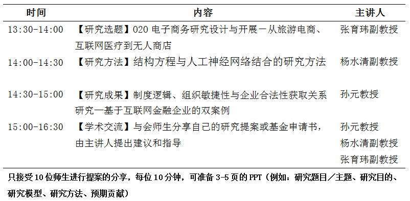 為了提升教師科研能力,加強科研論文寫作水平,經濟與管理學院張育瑋副教授邀請浙江工商大學孫元教授、浙江財經大學楊水清副教授一同開展本次學術工作坊。三位主講人都有SSCI/SCI期刊發表的豐富經驗,并且都兼任國際期刊編委、審稿專家。工作坊將包括研究選題、研究方法和研究成果三個部分的分享,在三位主講人分享后,歡迎與會師生分享自己的研究提案,主講人將就自身的專長和領域提出建議和指導,與會師生也可以針對自己在科研工作上遇到的問題進行交流。