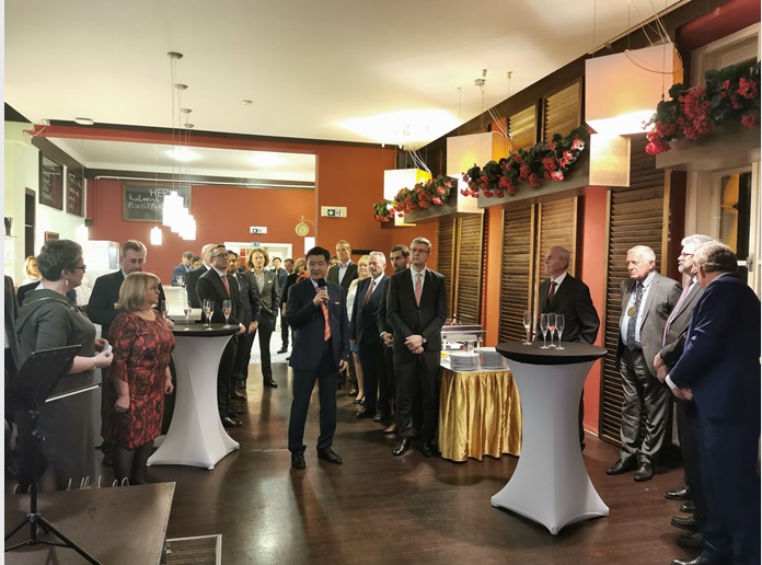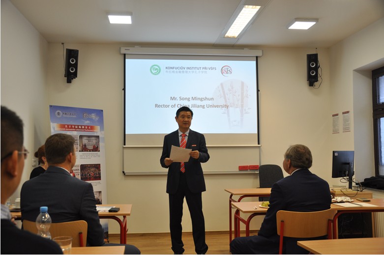 當晚,布拉格金融管理大學還舉行了歡迎酒會。捷克副總理兼工貿部部長卡雷爾·哈夫利切克,捷克前總統(tǒng)瓦沁拉夫·克勞斯等重要嘉賓應邀出席。我校校長宋明順應邀在歡迎酒會前代表孔子學院中方共建學校致辭發(fā)言。宋校長簡要介紹了我校情況,并對各位嘉賓的到來表示感謝,同時他希望雙方能依托孔子學院開展形式多樣的文化交流活動,把孔子學院打造成為兩國人民相互了解的窗口,增進友誼的橋梁和文化交流的平臺。