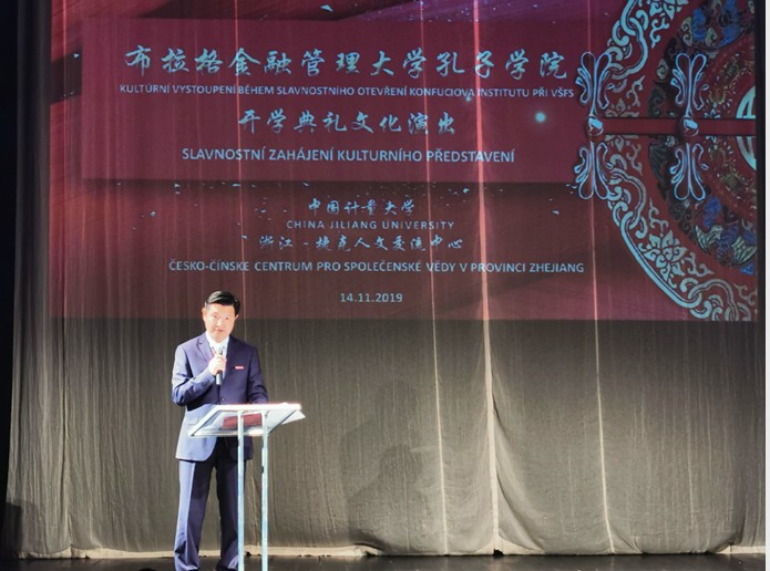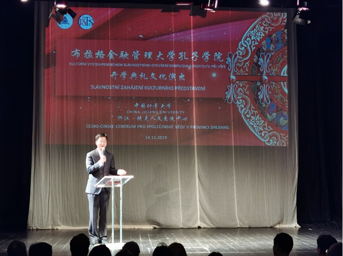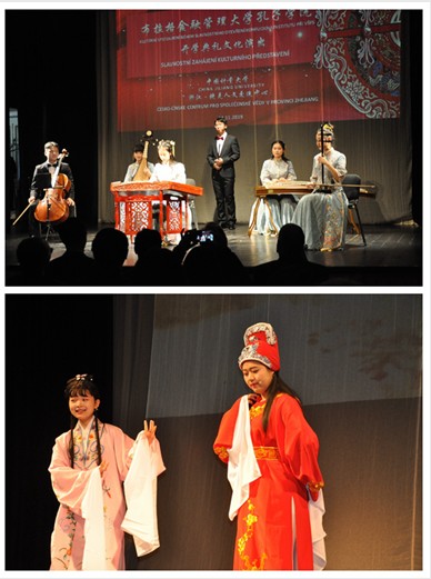 2019年11月14日,我校在布拉格市中心Mana Divadlo歌劇院隆重舉行浙江-捷克人文交流中心暨布拉格金融管理大學(xué)孔子學(xué)院開學(xué)典禮文化演出活動。中國駐捷克大使張建敏、中國駐捷克大使館教育組負(fù)責(zé)人趙長濤、我校校長宋明順、布拉格金融管理大學(xué)校長波滬斯拉娃·申基洛娃、捷中友好合作協(xié)會執(zhí)行副會長彼得·莫哈雷克等嘉賓,歐洲華捷發(fā)展有限公司董事長張鳳德等捷克浙資企業(yè)代表和布拉格金融管理大學(xué)師生等170余人觀看文化演出活動。