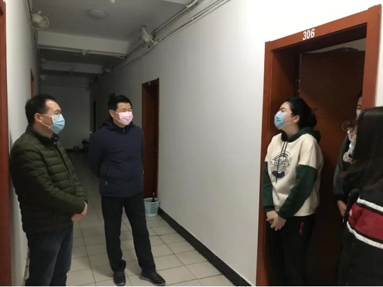2月9日上午,我校校長宋明順前往生活區13棟留學生公寓樓看望留校的國際學生,國際教育學院院長吳宏寬陪同前往。