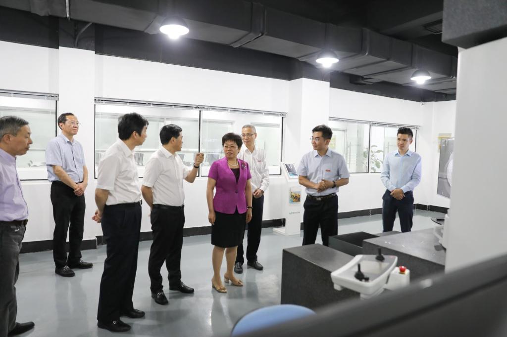 隨后,陳奕君一行來到我校精密測量與智能制造工程研究院調研指導。占地面積1200平方米、儀器設備投入超過1億元以上的精密測量與智能制造工程研究院是我校與海克斯康集團合作共建的集科研、教學和社會服務于一體的新型產教融合平臺。研究院面向“工業4.0”,以質量為核心,圍繞精密測量與智能制造,開展與產品設計、仿真驗證和質量檢測等方案的研發和技術服務。實驗室內,技術設備正忙碌運轉著,返校復課的師生們在崗位全心投入科研。陳奕君在工作人員的介紹下認真了解研究院的建院歷史和先進成果。在一臺國際最先進的三坐標測量系統設備面前,陳奕君詳細了解該設備的生產商、裝置、功能等情況后表示,高精尖設備對我國制造業現代化發展至關重要,高校要集中優勢力量進行科研攻關,開發先進科研儀器設備,持之以恒解決關鍵核心技術“卡脖子”問題,為推動浙江省數字經濟“一號工程”和經濟高質量發展貢獻力量。同時,要主動運用科研設備開展學生培養、社會服務等工作。