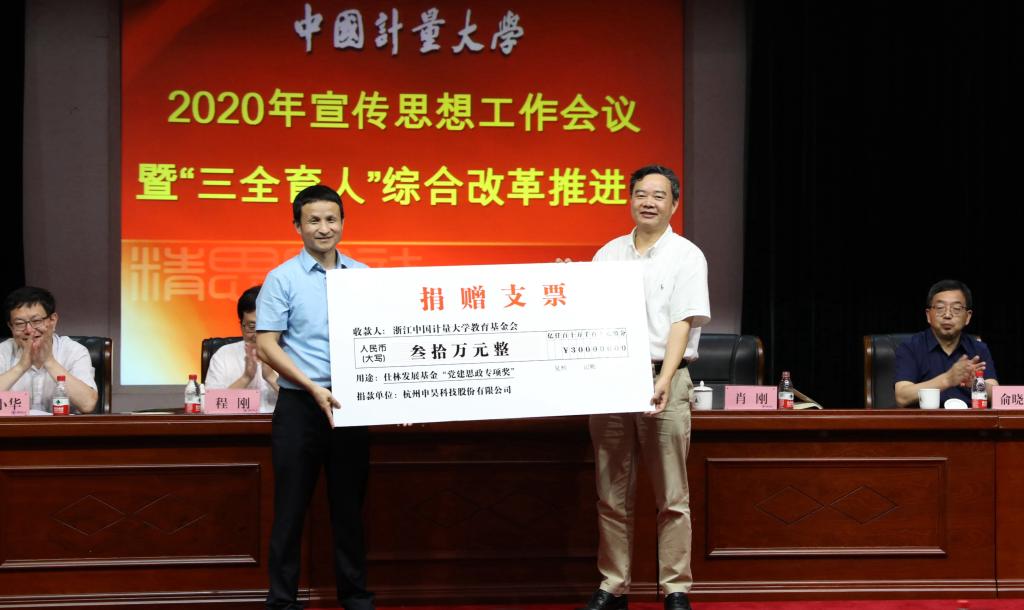 大會還進行了黨建思政專項獎教金捐贈儀式。在我校發展委員會副主任、校友總會會長馮時林的溝通聯絡下,杭州申昊科技股份有限公司向我校捐贈30萬元,設立仕林發展基金“黨建思政專項獎”,專門用于鼓舞和激勵廣大黨建思政工作者加強自身修養、忠誠黨的教育事業,開拓創新,盡心履職,助力學生成長成才。杭州申昊科技股份有限公司總經理黎勇躍代表企業向學校捐贈,黨委副書記肖剛代表學校接受捐贈,并向黎勇躍總經理頒發了捐贈證書。