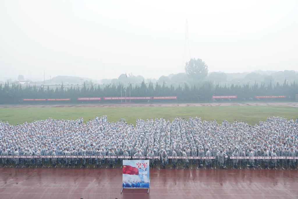 綠茵場上軍容嚴肅整齊,秋雨里的步伐鏗鏘有力。在雄壯的國歌聲中,鮮艷的國旗冉冉升起,軍訓動員大會正式拉開帷幕。