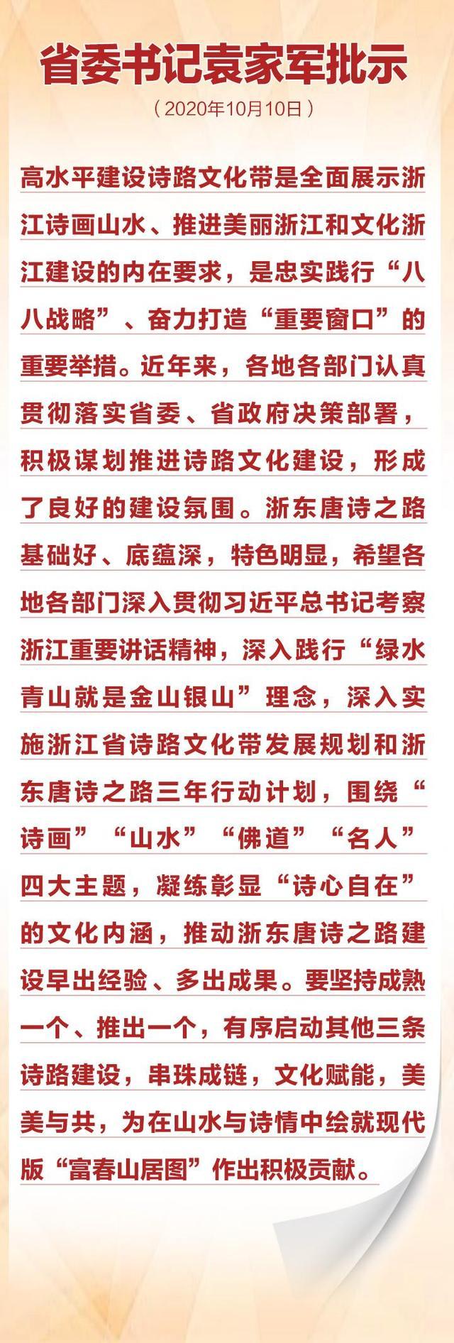 10月12日下午,浙江省詩路文化帶建設暨浙東唐詩之路啟動大會在天臺召開。省委書記袁家軍作出批示,省長鄭柵潔出席大會并發(fā)表講話。我校副校長葛洪良、人文與外語學院院長邱高興等出席了大會。邱高興教授在詩路文化長廊為鄭柵潔省長介紹了浙東詩路文化展覽的五個部分:序篇,李白的《送王屋山人魏萬還王屋》;第一部分悠悠渡口:西興、魚浦;第二部分鏡湖之歌:柯橋、紹興;第三部分剡溪風光:嵊州;第四部分夢游天姥吟留別:新昌;第五部分佛宗道源:天臺。