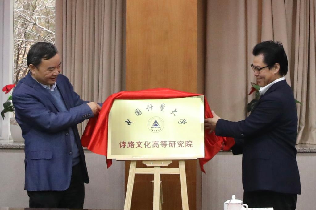 葉菁和肖剛共同為中國計量大學詩路文化高等研究院揭牌。肖剛為復旦大學蔣凡教授,中國唐詩之路研究會會長、南開大學盧盛江教授,中國韻文學會會長、中國唐詩之路研究會副會長、浙江工業大學校務委員會常務副主任肖瑞峰教授,中國唐詩之路研究會副會長、浙江大學胡可先教授頒發詩路文化高等研究院學術顧問聘書。