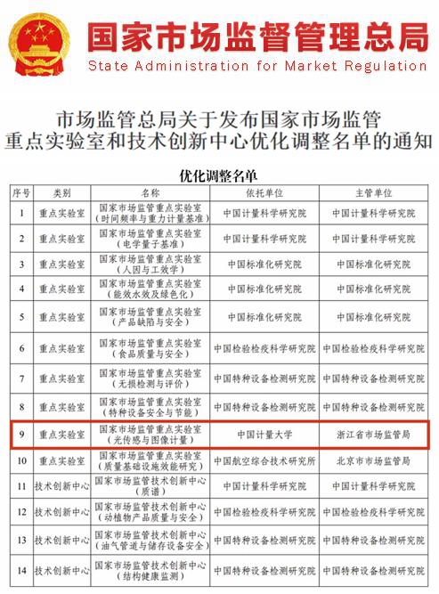 近日,市場監(jiān)管總局發(fā)布了國家市場監(jiān)管重點實驗室和技術(shù)創(chuàng)新中心優(yōu)化調(diào)整名單。通過形式審查、專家評審和現(xiàn)場核查等程序,經(jīng)研究共形成了10個國家市場監(jiān)管重點實驗室和4個國家市場監(jiān)管技術(shù)創(chuàng)新中心。我校光傳感與圖像計量國家市場監(jiān)管重點實驗室位列其中,是唯一一個以高校為依托單位的實驗室。