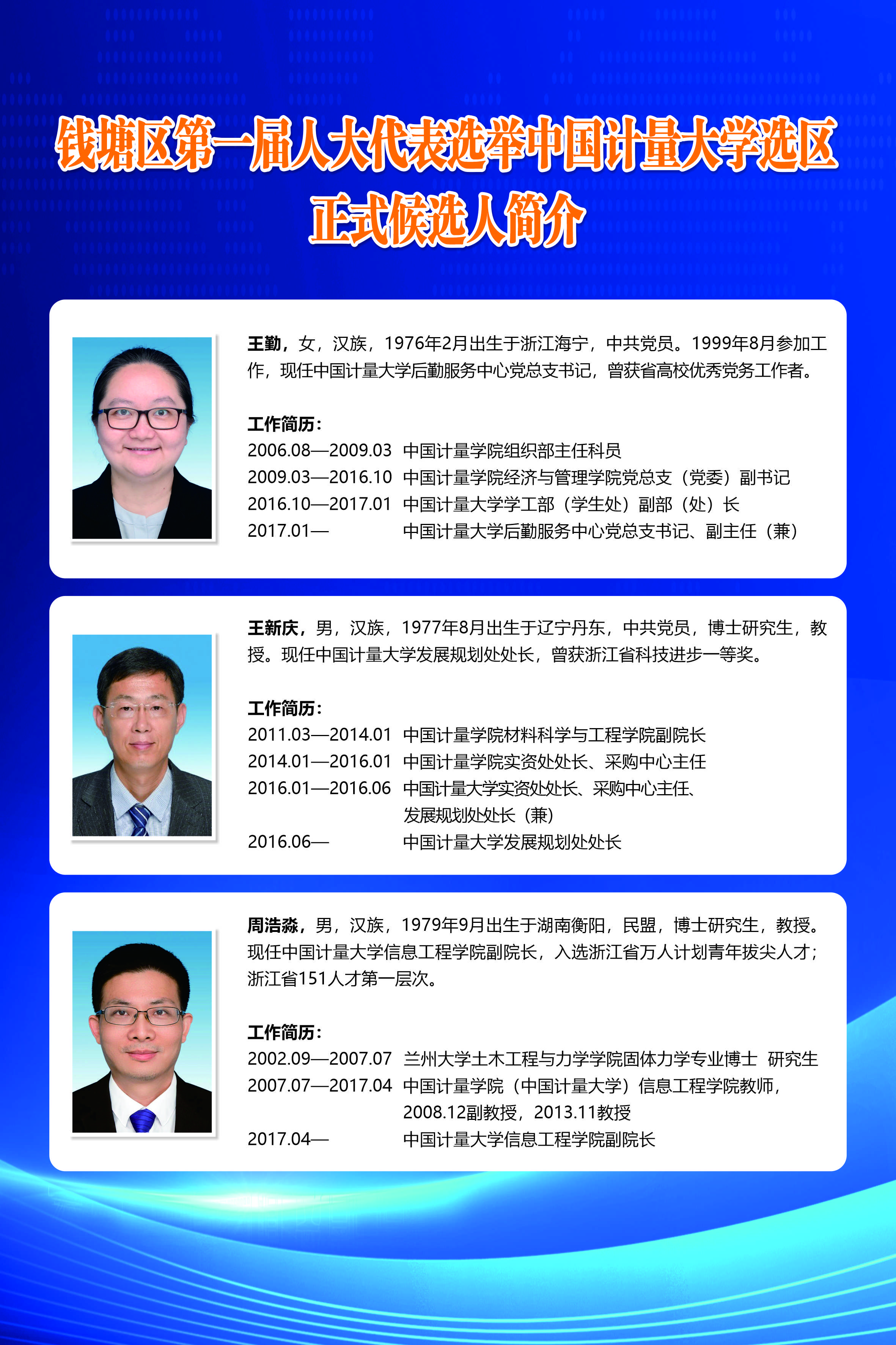 根據(jù)白楊街道選舉工作領(lǐng)導(dǎo)小組統(tǒng)一安排部署,錢塘區(qū)第一屆人大代表選舉工作即將進(jìn)入投票階段。學(xué)校經(jīng)過、推薦、醞釀、討論和協(xié)商等法定程序,后勤服務(wù)中心黨總支書記王勤、發(fā)規(guī)處處長王新慶、信息工程學(xué)院副院長周浩淼成為錢塘區(qū)第一屆人大代表選舉中國計(jì)量大學(xué)選區(qū)正式候選人。5月26日,學(xué)校進(jìn)入選區(qū)正式候選人與所在選區(qū)選民見面環(huán)節(jié),正式候選人和選民在聞廳二樓報(bào)告廳面對面,200余名選民代表參加見面會。