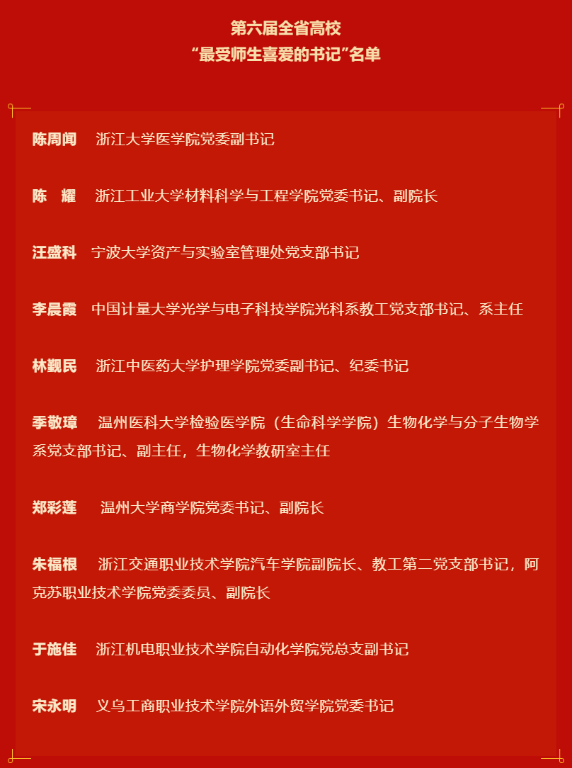 根據全省教育系統慶祝中國共產黨成立100周年系列活動和黨史學習教育安排,為充分發揮先進典型的示范引領作用,選樹一批模范傳承紅色基因、踐行初心使命的高校基層黨組織書記,經浙江省教育廳同意,省普通高校黨建研究專業委員會、浙江教育報刊總社組織開展了第六屆全省高校“最受師生喜愛的書記”選樹宣傳活動。我校光電學院光科系“雙帶頭人”教工黨支部書記李晨霞同志在近百名人選中脫穎而出,榮獲第六屆全省高校“最受師生喜愛的書記”稱號,全省高校僅10名同志入選。全體黨支部書記要以“最受師生喜愛的書記”為榜樣,深入學習貫徹習近平新時代中國特色社會主義思想,始終不忘為黨育人、為國育才的初心和使命,堅決貫徹上級決策部署,不斷加強黨組織自身建設,持續推動學校黨建工作躍遷升級,向黨的百年華誕獻禮。