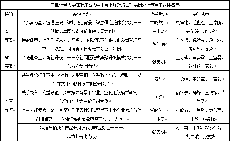 由浙江省教育廳、浙江省大學生科技競賽委員會主辦,杭州電子科技大學、浙江農(nóng)林大學承辦的浙江省大學生第七屆經(jīng)濟管理案例分析競賽日前落下帷幕,本次競賽規(guī)模大、覆蓋面廣,共有來自全省72所高校498支隊伍參賽,我校共推薦12支隊伍參加,經(jīng)過初賽篩選、決賽答辯,我校共榮獲2項一等獎,1項二等獎,4項三等獎。