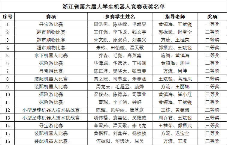 近日,浙江省第六屆大學生機器人競賽在杭州職業技術學院圓滿結束,我校共有42名學生組成的16支隊伍參加,共摘得省一等獎1項,省二等獎8項,省三等獎7項,參賽隊伍均在比賽中獲獎,創我校在該項賽事中的最好成績。