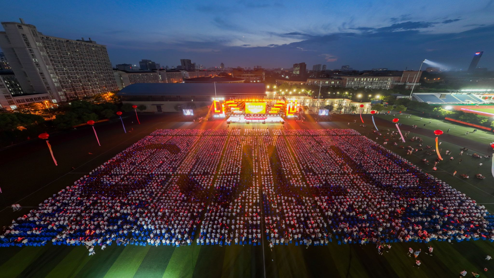 這次的開學典禮可謂賺足眼球。身著白、藍兩種顏色服裝的2022級新生們陸續落座,組成一個巨大的“CJLU”,并通過無人機俯拍投映在屏幕上,場面十分震撼。此外,現場還擺放了發光立牌“中量大歡迎你”以及合影板手牌。伴著激情熱烈的暖場音樂,新生們揮舞著手中的熒光棒,一張張青春洋溢的臉龐讓人感受到無盡的活力。