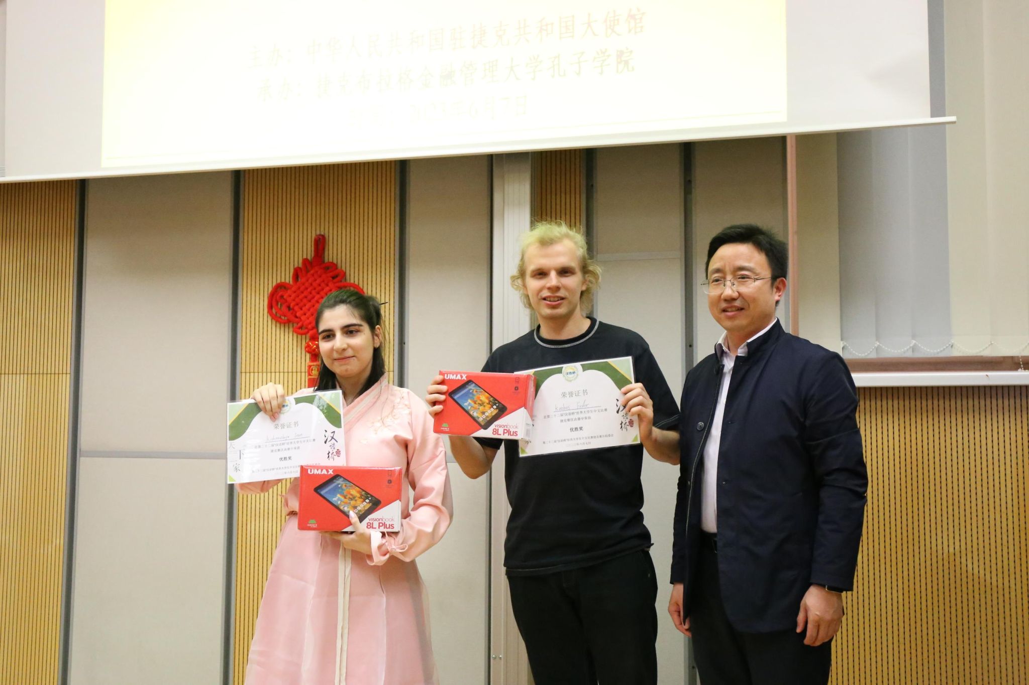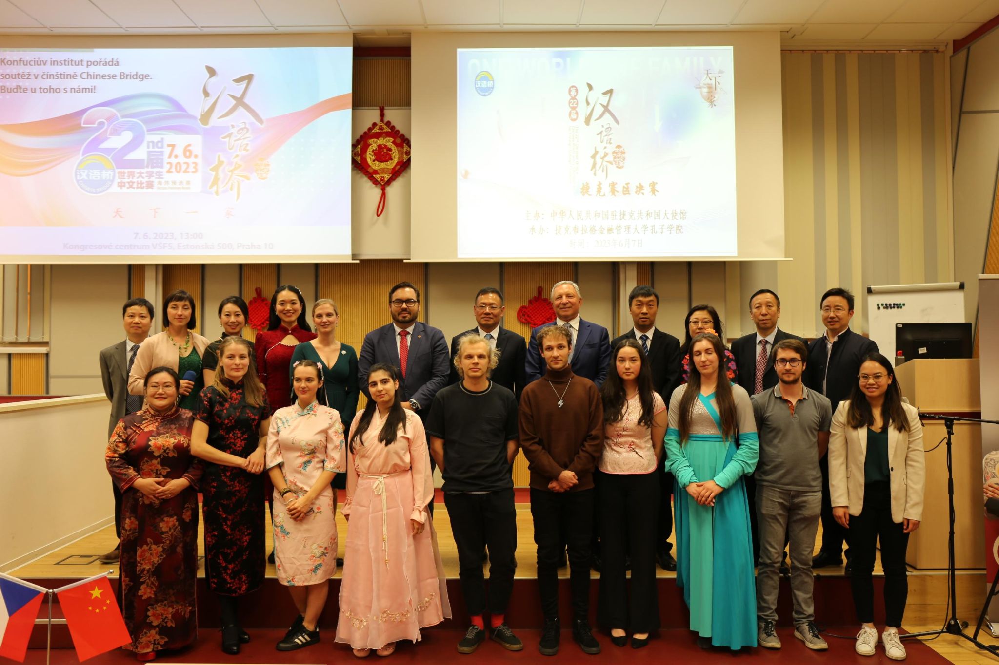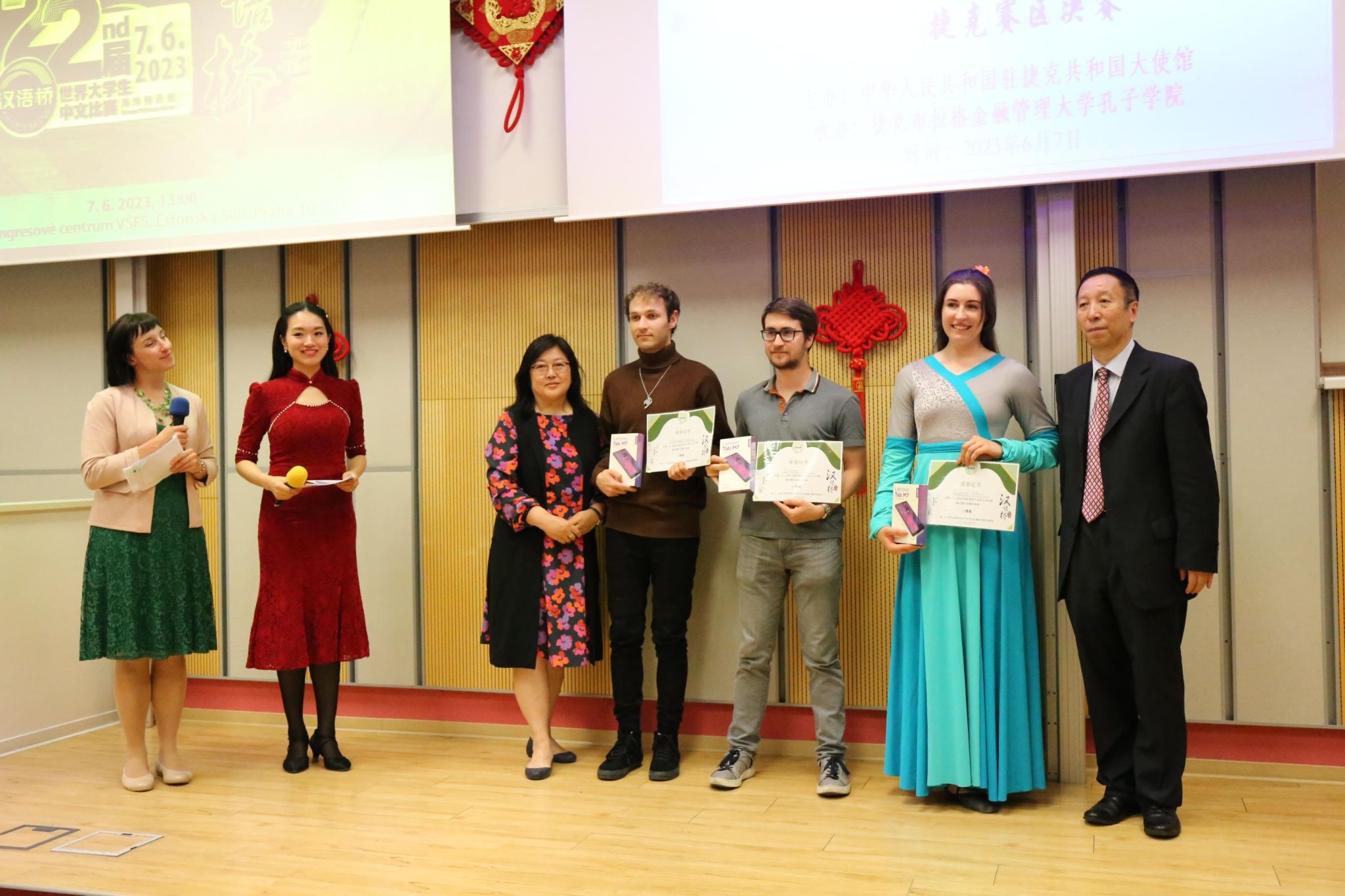 當地時間2023年6月7日,由中國駐捷克大使館主辦、布拉格金融管理大學孔子學院承辦的第22屆“漢語橋”世界大學生中文比賽捷克賽區決賽在布拉格金融管理大學落下帷幕。中華人民共和國駐捷克共和國大使馮飚、教育事務負責人蔣宇鵬、布拉格金融管理大學董事會副主席Emil ?enky?、副校長Petr Budinsky、國際處處長Lucie Finová等作為大賽嘉賓,布拉格金融大學孔子學院中方院長姜輝、帕拉茨基大學孔子學院中方院長陳忠、布杰約維采商業技術學院孔子課堂中方院長郝文鈞、布拉格中華國際學校校長戴波作為大賽評委,布拉格金融管理大學師生以及來自光明日報、中歐文聯報、布拉格時報等媒體記者等50余人出席并觀摩比賽。比賽由布拉格金融管理大學孔子學院項目負責人Petra Mar?álková和文化專員狄小倩主持。