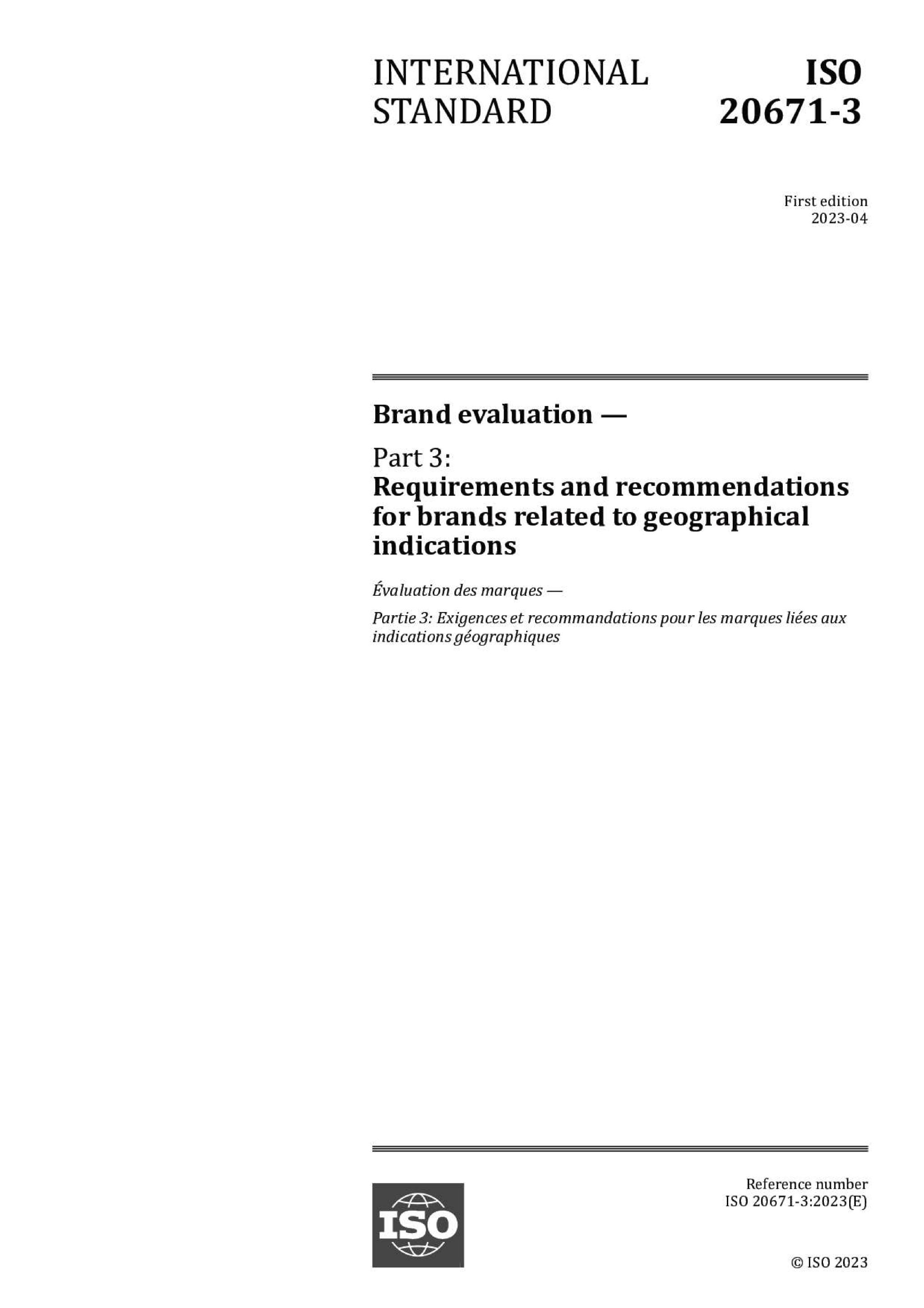 近日,由我校經濟與管理學院楊澤世研究員牽頭制定的ISO 20671-3:2023《Brand evaluation—Part 3:Requirements and recommendations for brands related to geographical indications》(《品牌評價 第3部分:與地理標志相關品牌評價指南》)國際標準正式發布。