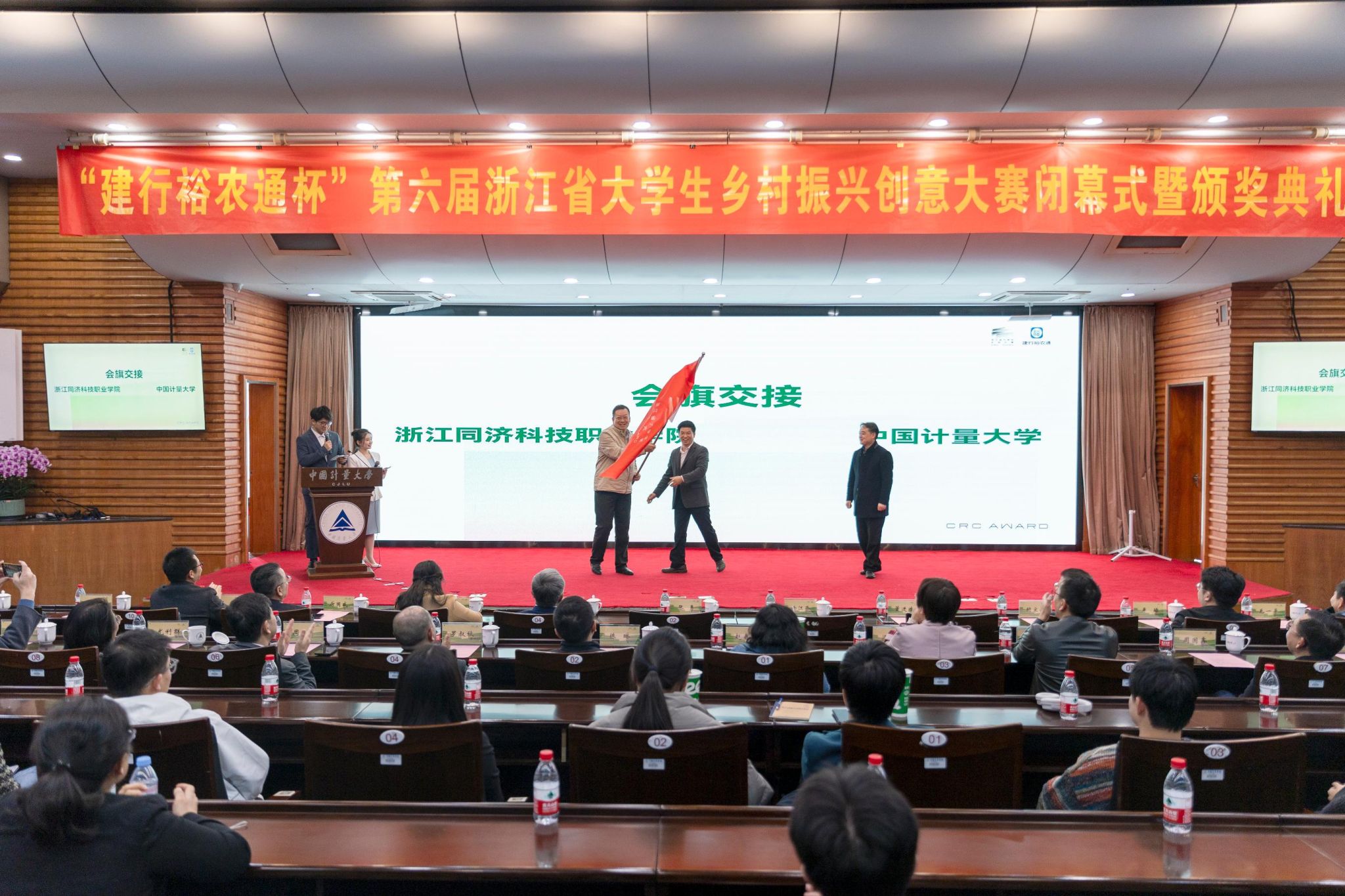 我校校長徐江榮在頒獎典禮上致辭。他向各主辦單位表示感謝,并對獲獎的團隊表示熱烈祝賀。他表示,大學生鄉村振興創意大賽在高校和鄉村之間構建起一座青春之橋,引領了更多的高校師生們帶著課題與項目深入鄉村,以實際行動助推鄉村農文旅融合發展,是深入踐行“八八戰略”和“千萬工程”的生動體現。中國計量大學將充分發揮計量、標準、質量、市場監管和檢驗檢疫的辦學特色,為建設共同富裕示范區、打造“重要窗口”繼續貢獻計量力量。