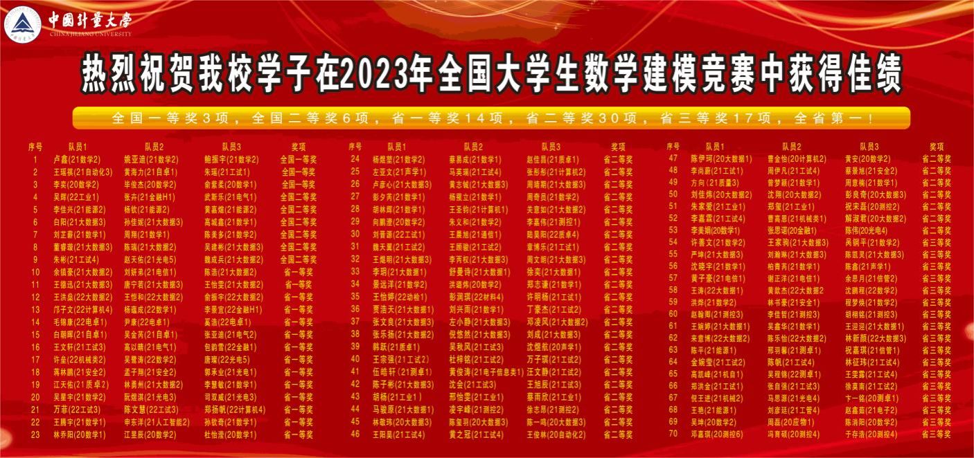 近日,2023年全國大學生數學建模競賽獲獎情況公布,我校再創佳績。在此次競賽中,我校共組織84支隊伍參賽,獲全國一等獎3項,全國二等獎6項,浙江省一等獎14項、二等獎30項、三等獎17項,獲獎總體情況位居全國前列,國家獎獲獎數量、總獲獎數量、獲獎率等多項硬核指標均位居浙江省榜首。