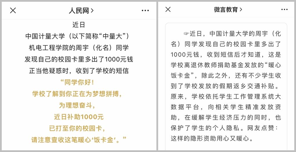 學校始終以學生需求為中心,扎實推進資助育人工作,這一暖心舉措受到了人民網、光明日報、中國青年報等多家國家級主流媒體,教育部、團中央等部門政務新媒體的點贊和關注。1月16日,人民網公眾號發布《大學生準備期末考,卡里多出1000元?》;1月17日,教育部政務新媒體“微言教育”在《你好,教育早新聞來了(2024.01.17)》一文中點贊中量大。在各大留言區收獲了眾多暖心評論,“‘看不見’的資助,看得見的用心”“總有人在默默守護學生們的柔軟心靈!為學校的暖心舉措點贊!”“有溫度的學校”……