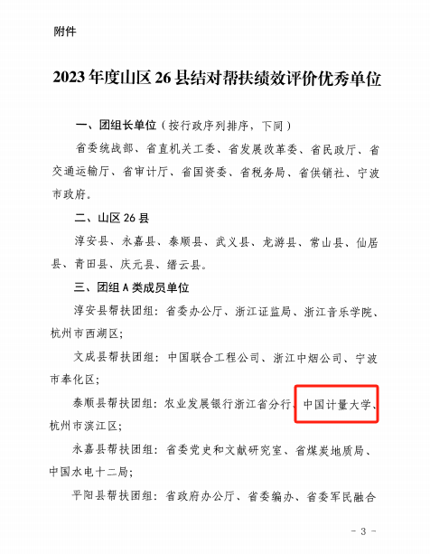 近日,中共浙江省委農村工作領導小組辦公室、浙江省鄉(xiāng)村振興局發(fā)布《關于公布2023年度山區(qū)26縣結對幫扶績效評價結果的通報》,中國計量大學榮獲2023年度結對幫扶“雙向賽馬”績效評價優(yōu)秀團組A類成員單位,是泰順幫扶團組獲評優(yōu)秀的三家單位之一。