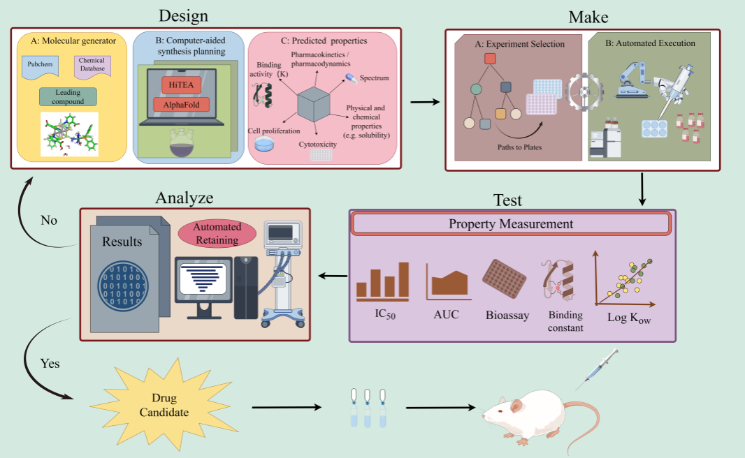 此研究一經發表,便引起了吳志平博士研究團隊的高度重視,經過詳細研究后認為可以將Koscher平臺的功能擴展到藥物先導物的發現和優化(hit-to-lead)過程中,從而有可能引起先導藥物智能化發現與優化革命性的突破。本文指出在新藥研發過程中,潛在候選藥物的理化性質和生物活性是藥物發現的關鍵,這為其可能的靶點和機制以及是否具有進一步的開發價值提供了信息。通常,具有理想生物活性的候選藥物是通過一系列結構優化實現的,中間化合物的數據是每一步的關鍵反饋。Koscher平臺正具有實現此過程的潛在前景。不同于以往模型預測和有限的化學空間檢索,該平臺利用模塊化方法結合機器學習(ML),允許整入新型技術設備模塊來測定藥物活性并可適應不同類型的新藥研發。本文指出雖然藥物活性的自動化測定的挑戰性遠高于染料分子性質的測定,但高效準確評估大量候選藥物的高通量技術、模擬活生物體微環境并允許精確控制藥物-生物分子相互作用的微流體芯片,以及為識別藥物及其代謝物結構提供強大工具的尖端質譜技術和軟件的快速進展為自動化優化篩選先導物提供了可靠的技術基礎。