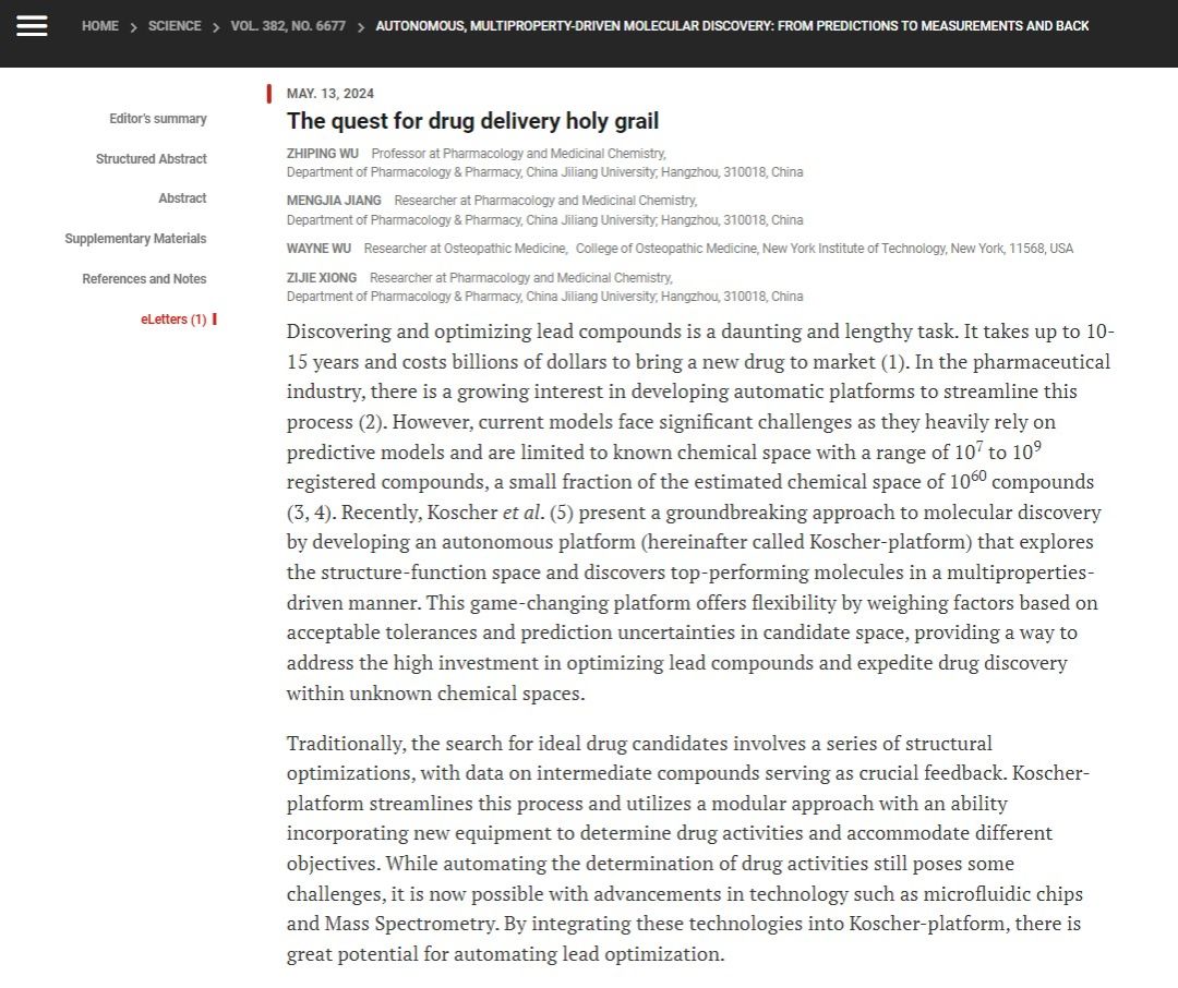 2024年5月13日,我校生命科學學院教師吳志平博士團隊(第一作者及通訊作者單位為中國計量大學)撰寫的觀點評述性文章“The quest for drug delivery holy grail”在線刊登于Science雜志網站的eLetters平臺。