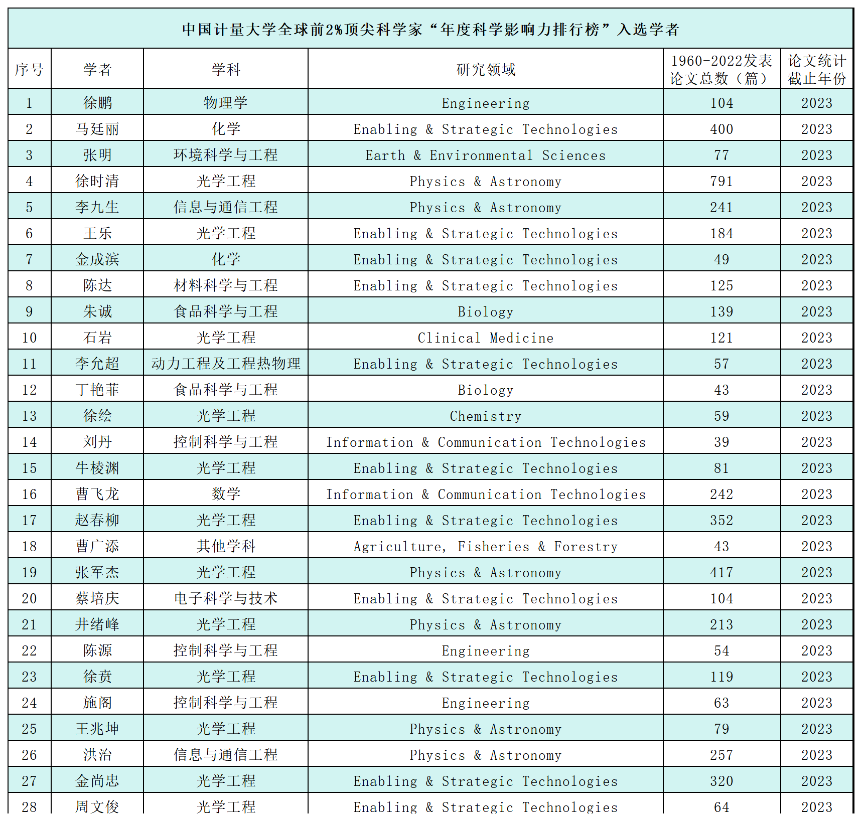 28位學者入選全球前2%頂尖科學家“年度科學影響力排行榜”榜單,分別是物理學學科的徐鵬,化學學科的馬廷麗、金成濱,環境科學與工程學科的張明,光學工程學科的徐時清、王樂、石巖、徐繪、牛棱淵、趙春柳、張軍杰、井緒峰、徐賁、王兆坤、金尚忠、周文俊,信息與通信工程學科的李九生、洪治,材料科學與工程學科的陳達,食品科學與工程學科的朱誠、丁艷菲,動力工程及工程熱物理學科的李允超,控制科學與工程學科的劉丹、陳源、施閣,數學學科的曹飛龍,電子科學與技術學科的蔡培慶和其他學科的曹廣添。