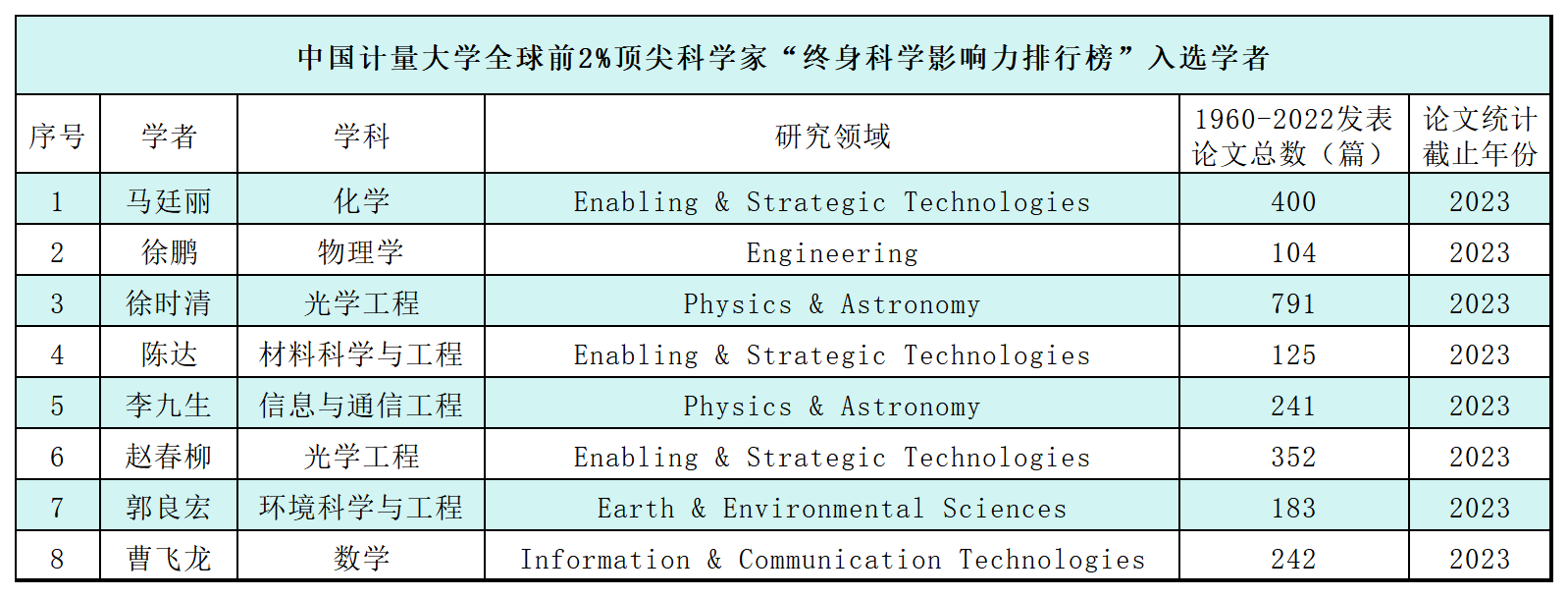8位學者入選全球前2%頂尖科學家“終身科學影響力排行榜”,分別是化學學科的馬廷麗,物理學學科的徐鵬,光學工程學科的徐時清、趙春柳,材料科學與工程學科的陳達,信息與通信工程學科的李九生、環境科學與工程學科的郭良宏、數學學科的曹飛龍。