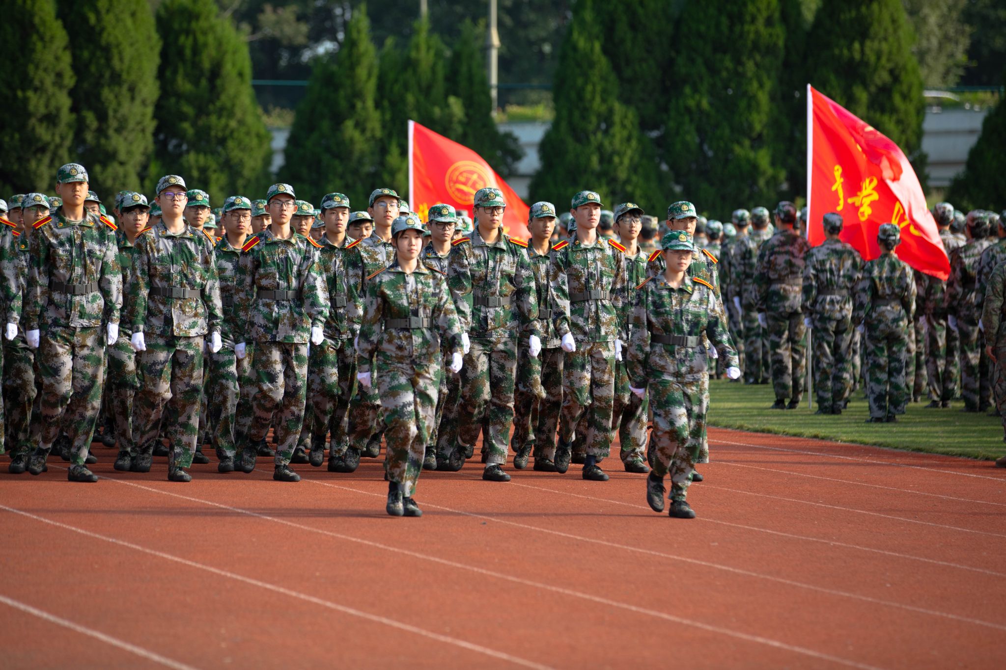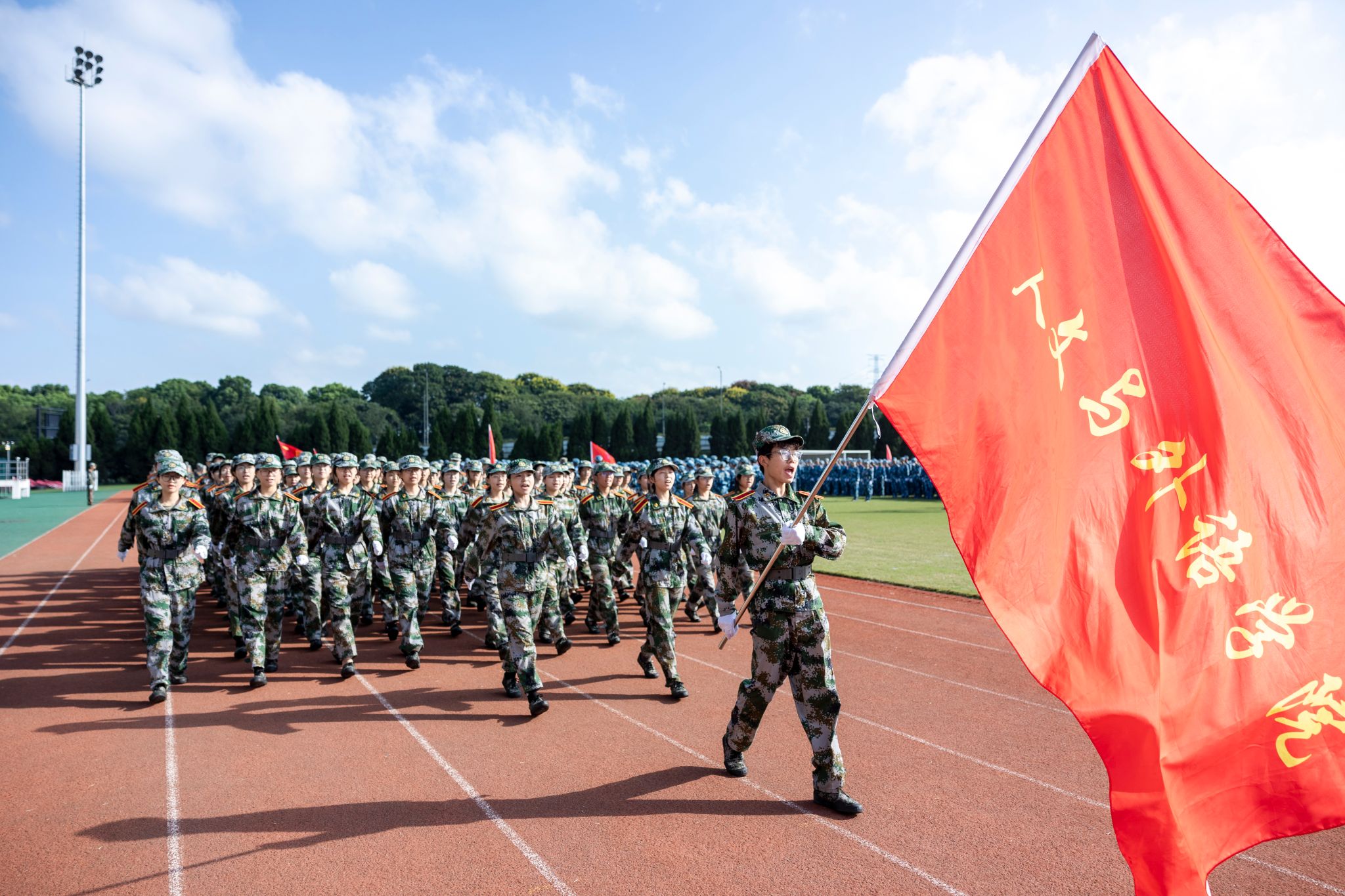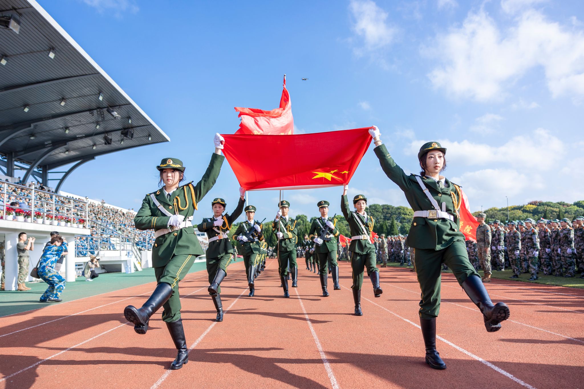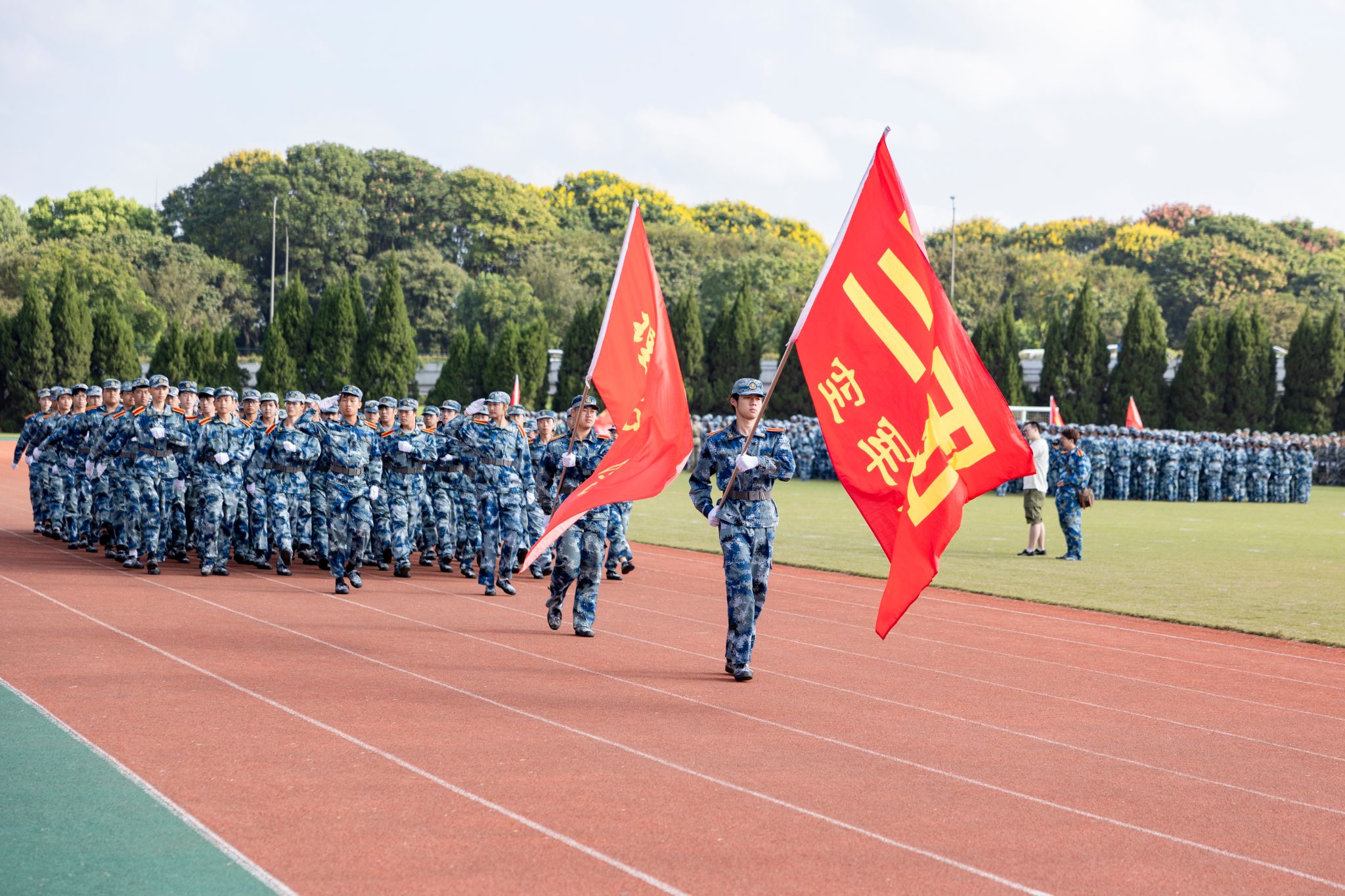 戎裝在身,熱血在懷。分列式上,國旗護衛隊持槍方陣邁著鏗鏘的步伐依序向主席臺走來,他們英姿挺拔、步履劃一。各營方陣緊隨其后,闊步走來、氣宇軒昂,陽光下汗水淌過的臉頰,早已褪去青澀懵懂,充滿堅毅自信。