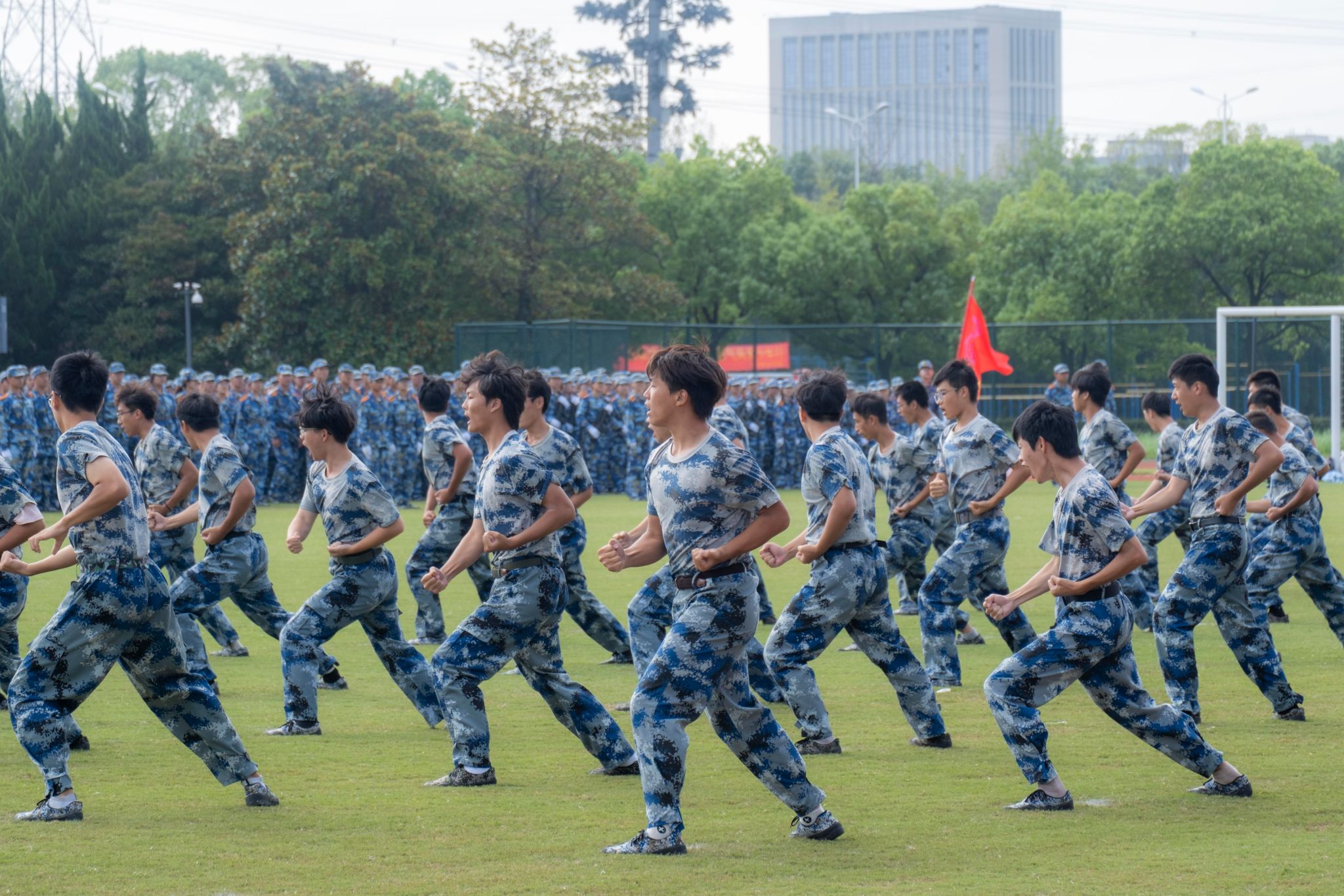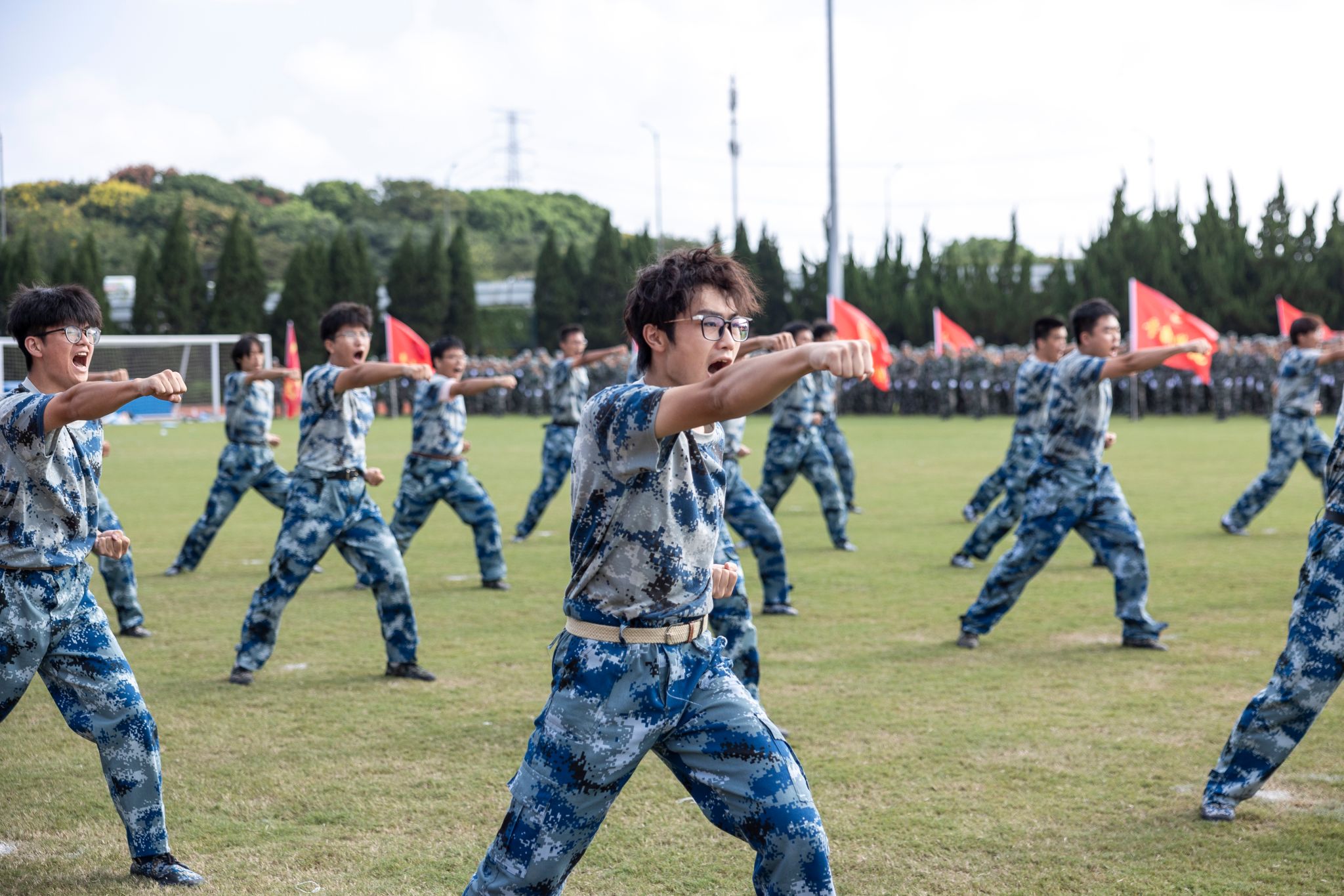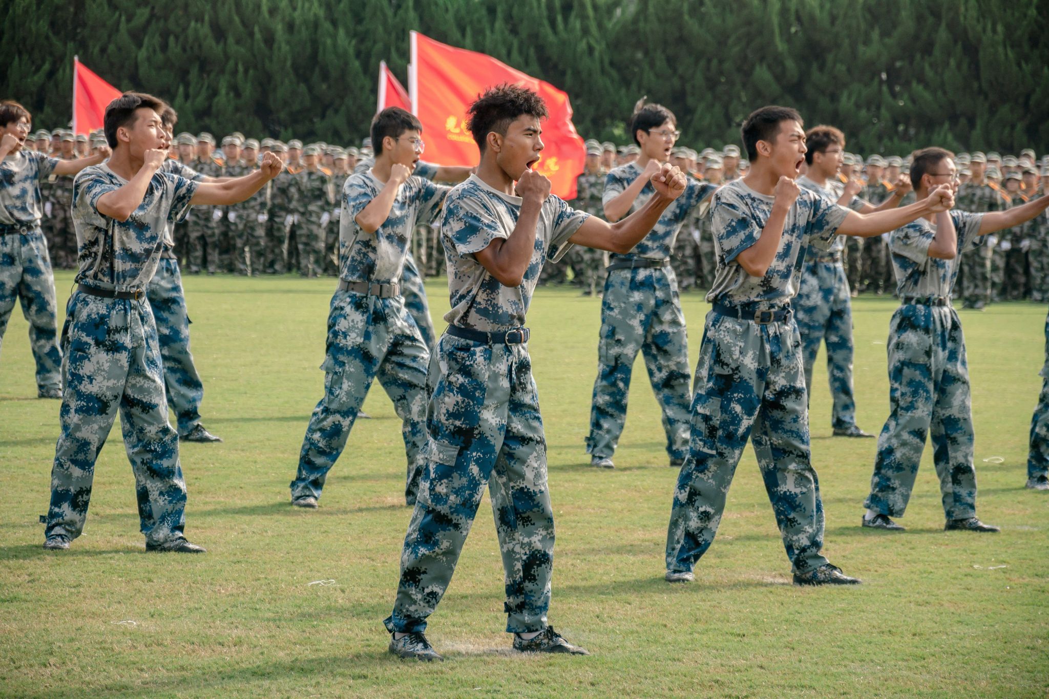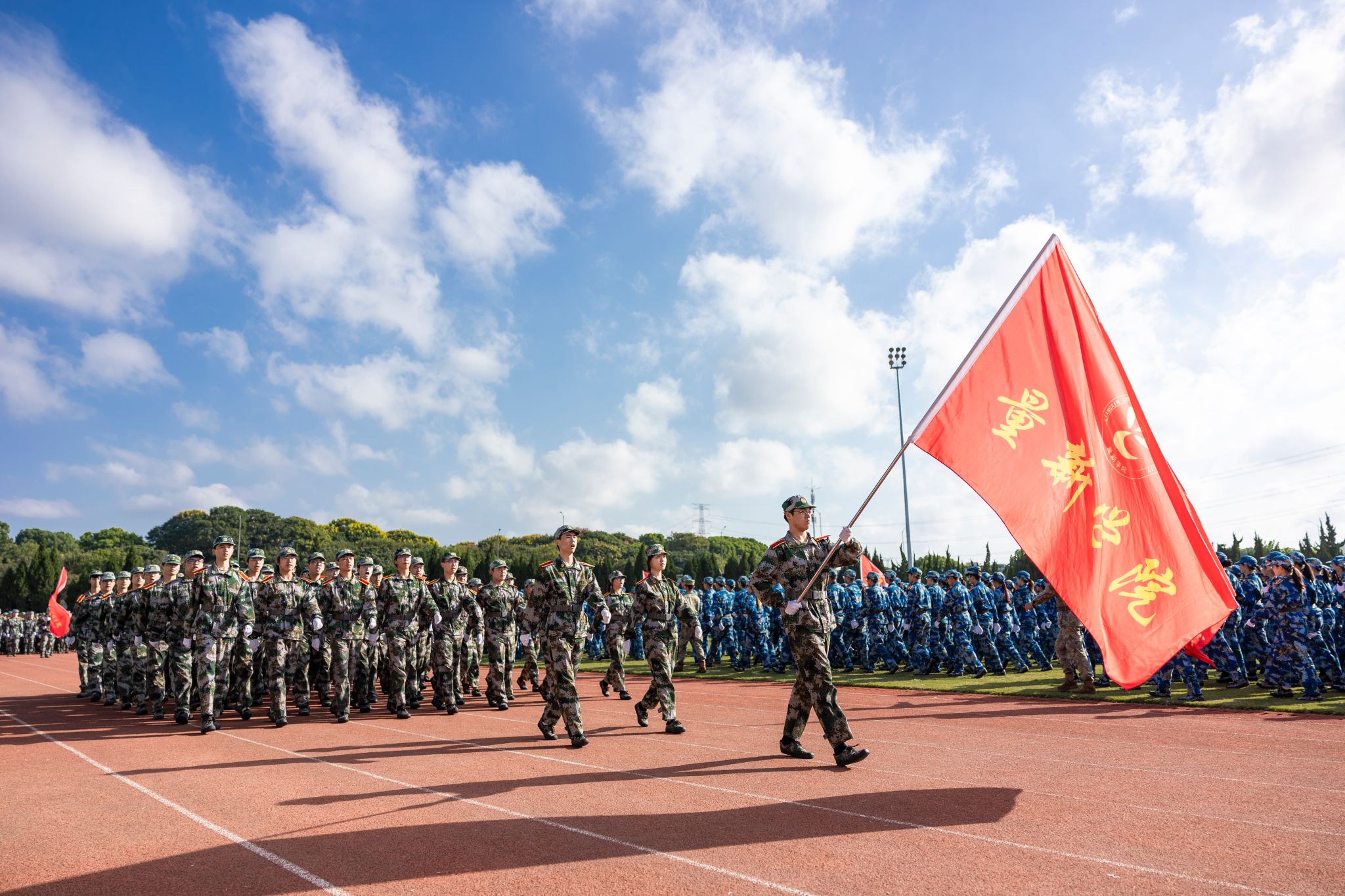 戎裝在身,熱血在懷。分列式上,國旗護衛隊持槍方陣邁著鏗鏘的步伐依序向主席臺走來,他們英姿挺拔、步履劃一。各營方陣緊隨其后,闊步走來、氣宇軒昂,陽光下汗水淌過的臉頰,早已褪去青澀懵懂,充滿堅毅自信。