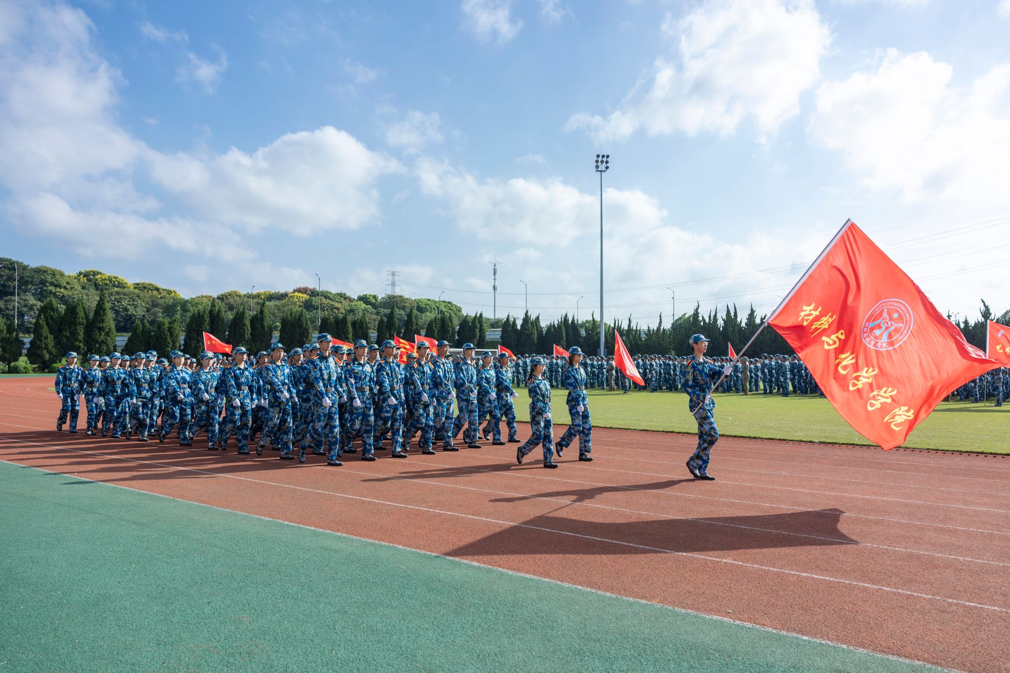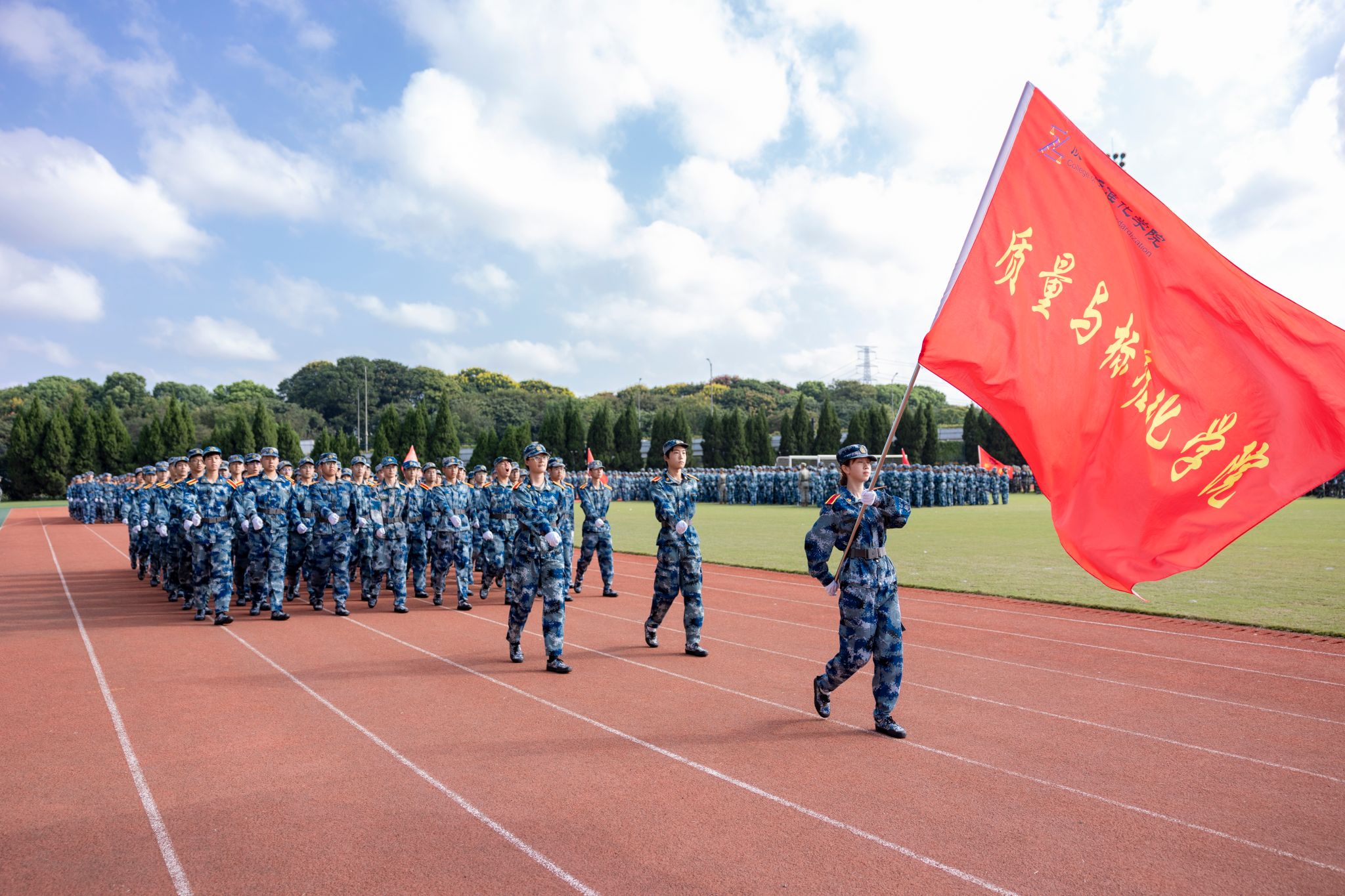 王新慶作軍訓總結講話。他表示,在軍訓生活中,同學們發揚艱苦奮斗、頑強拼搏的精神,經受住了烈日和高溫、臺風和雨水的考驗。在訓練中強健體魄,在磨礪中突破自我,完成了各項軍訓科目,掌握了基本軍事技能,增強了組織紀律性,鞏固了國防觀念和集體主義觀念,培養了吃苦耐勞、堅持不懈的品質,形成了團結協作、顧全大局的優良作風。他希望同學們要積極向上,健康生活。保持健康的生活方式,讓優秀成為一種習慣。要勤學篤行,求是創新。努力掌握科學文化知識和專業技能,以腳踏實地打牢學業根基,以創新思維練就過硬本領。要珍惜當下,天道酬勤。軍訓只是入學第一課,要通過辛勤學習去認清自我,提升自我,超越自我。