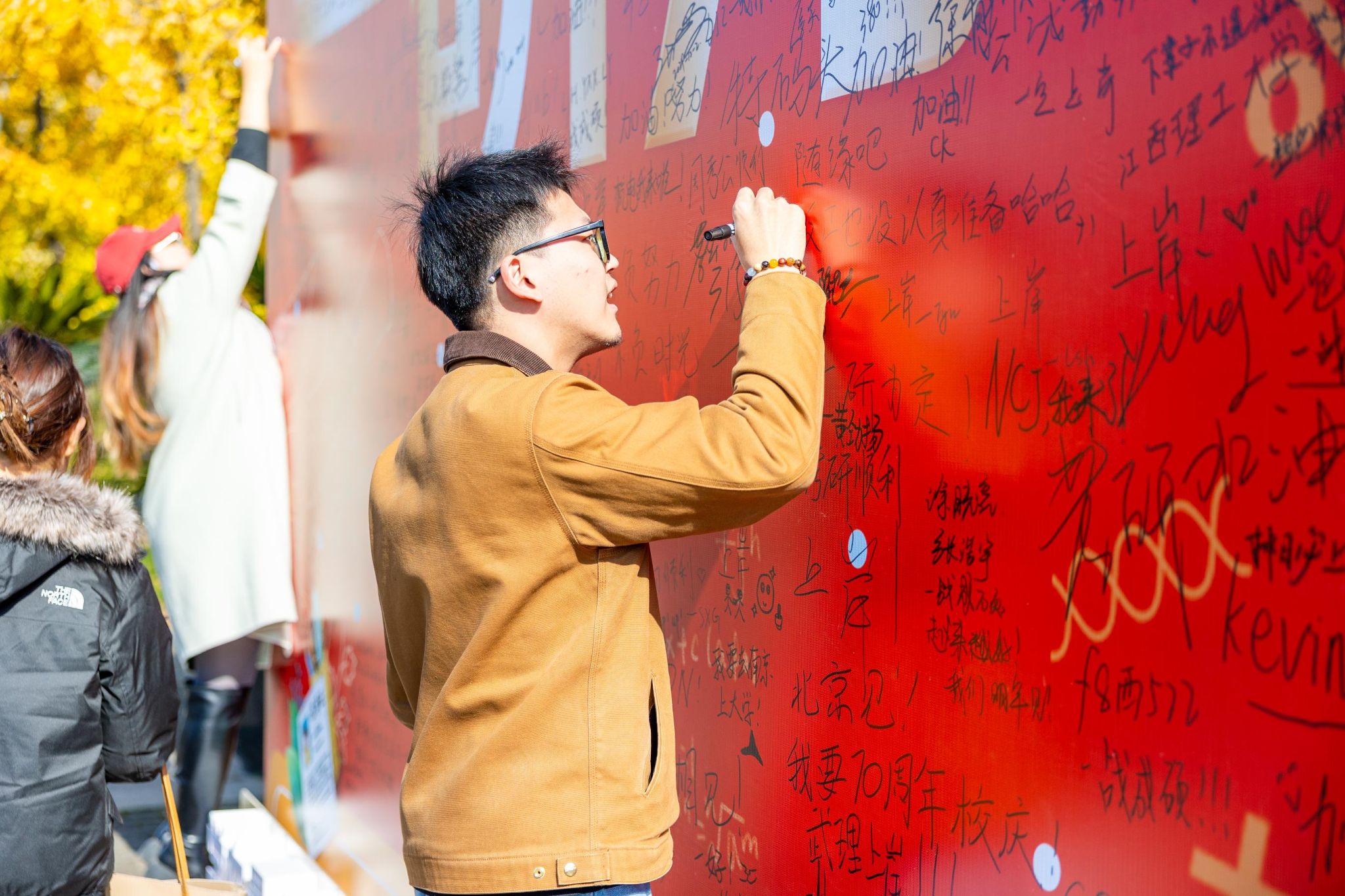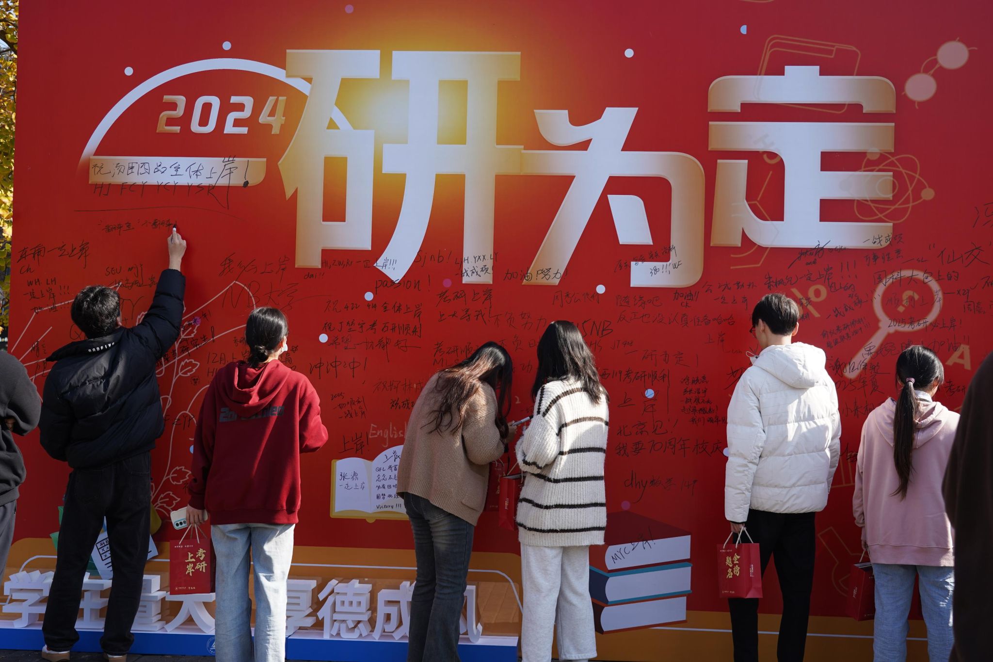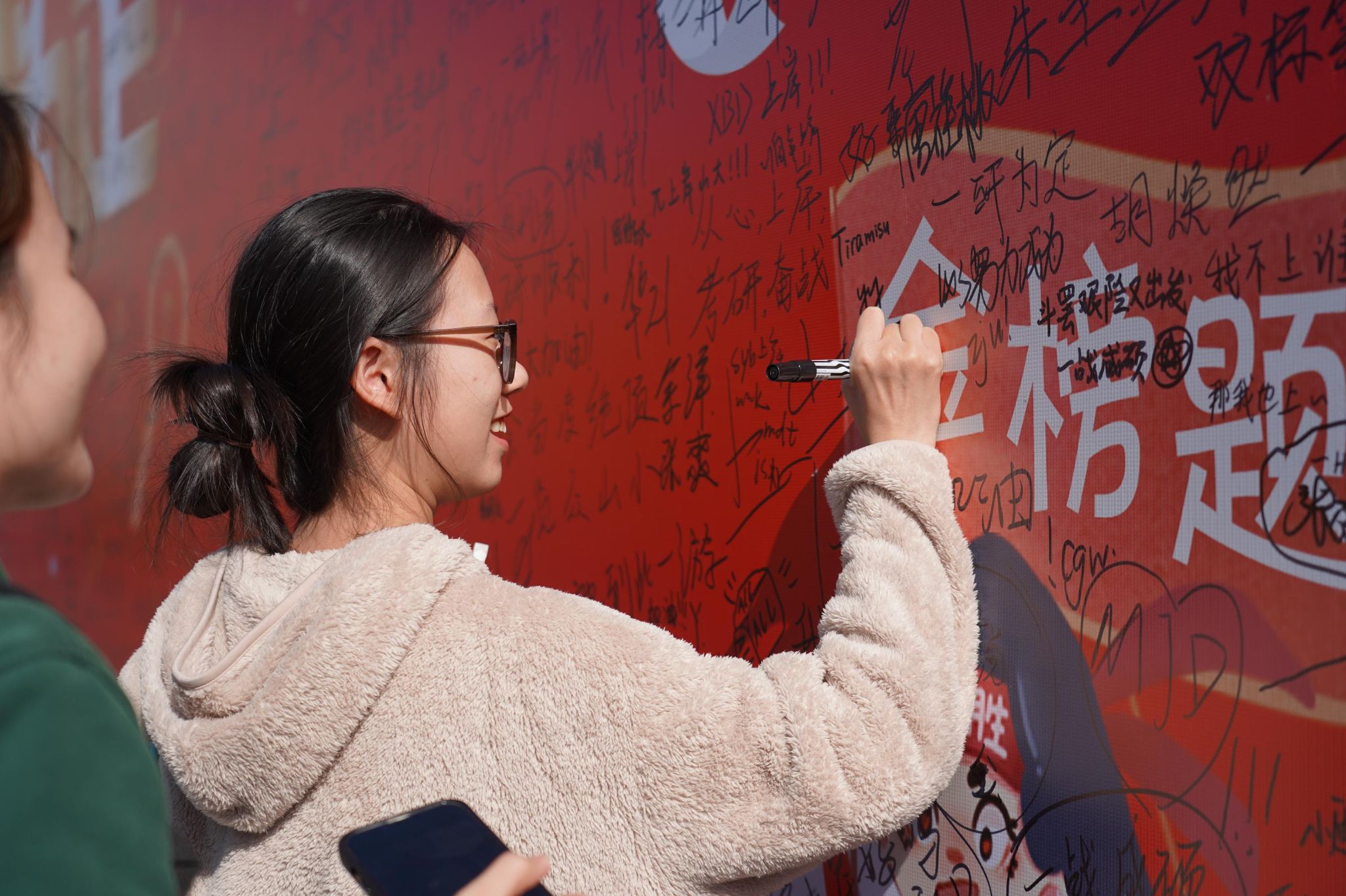 “一定上岸!”“考研必勝!”“一戰成碩!”同學們在簽名墻上留下自己的愿望和祝福,共同期待一個美好的未來。