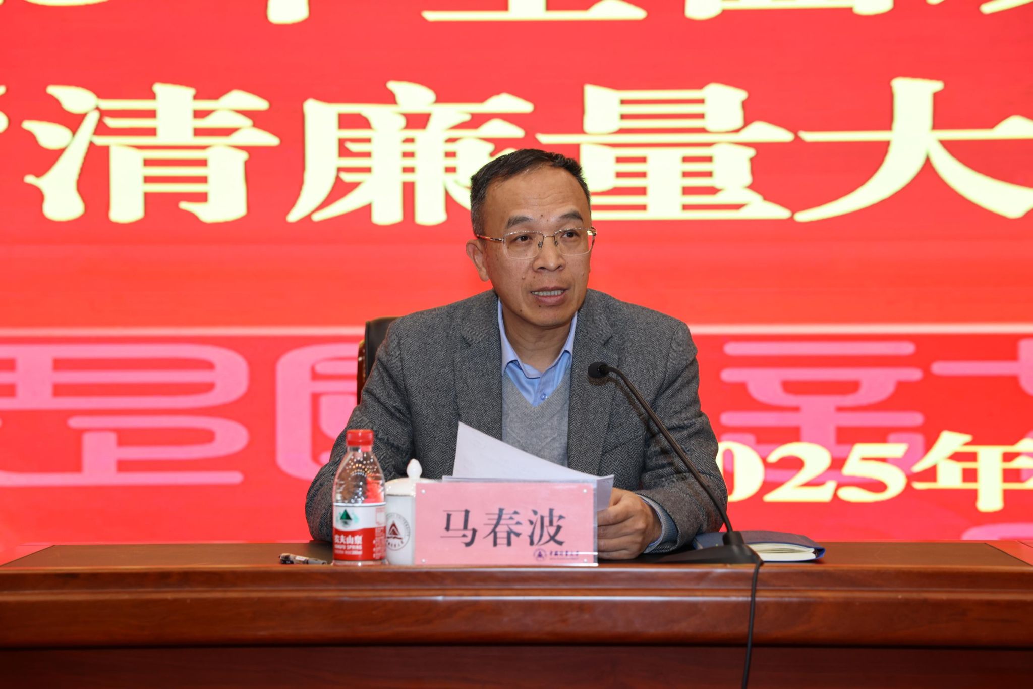 紀委書記馬春波指出,要深刻領悟黨風廉政建設的新形勢新任務,把思想和行動統一到以習近平同志為核心的黨中央對反腐敗斗爭形勢的科學判斷上來。馬春波全面回顧了2024年黨風廉政建設新成效,指出黨風廉政建設推進中仍存在痛點堵點。馬春波提出,新的一年要堅持以習近平新時代中國特色社會主義思想為指導,以六個“聚力”和六個“縱深推進”為具體舉措,以高質量推進正風肅紀反腐工作指引為抓手,以紀檢監察工作規范化、法治化、正規化建設為支撐,縱深推進黨風廉政建設和反腐敗斗爭,一體推進“三不腐”,以全面從嚴治黨新成效為學校各項事業高質量發展提供堅強政治保障。