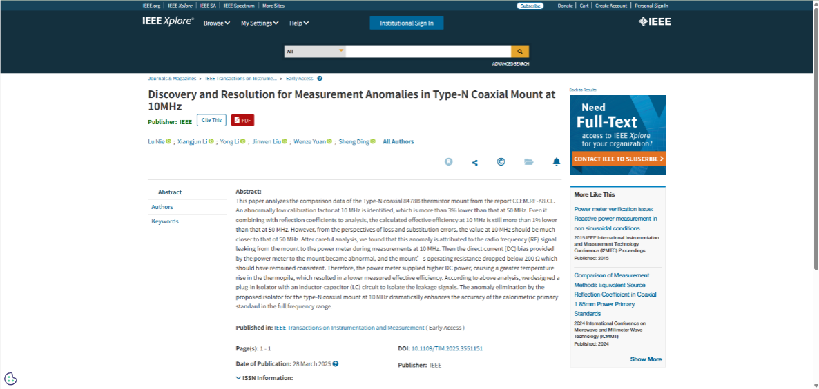 近日,我校信息工程學院聯合中國計量科學院研究院在計量測試領域國際頂級期刊《IEEE Transactions on Instrumentation and Measurement》(中科院二區TOP期刊,IF=5.6)上發表關于射頻功率計量的研究論文“Discovery and Resolution for Measurement Anomalies in Type-N Coaxial Mount at 10MHz”(2025, 3551151)。該論文以我校為第一單位,碩士研究生聶祿為第一作者,中國計量科學研究院的崔孝海研究員和我校李向軍副教授為論文共同通訊作者。