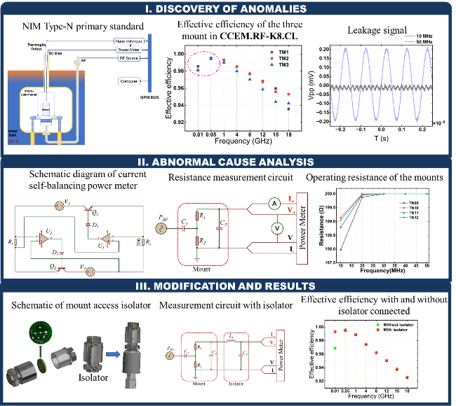 該研究首次發現國際功率參數計量比對CCEM.RF-K8.CL研究報告中“各國提交的8478B熱敏座在10 MHz頻點的參考值系統性偏低于50 MHz頻點”的異常現象。基于損耗特性與替代誤差理論分析,該雙頻點的有效效率本應高度趨同,通過基準量熱實驗復現的結果也進一步驗證了該異常的系統性特征。通過對N型功率基準的組成結構與測量原理進行深入分析,論文揭示了異常機理:當測量10MHz頻段有效效率時,受8478B座自身特性影響,其無法實現射頻信號的完全吸收,導致部分信號泄漏至功率計,這種泄漏干擾造成功率計工作狀態失準,最終引發該頻點測量結果異常。針對該技術瓶頸,論文創新性提出了LC隔離器解決方案。實驗表明,該器件可有效抑制泄漏信號對功率計系統的串擾,成功解決了N型同軸量熱式功率基準在10MHz頻點長期存在的有效效率定標異常問題。