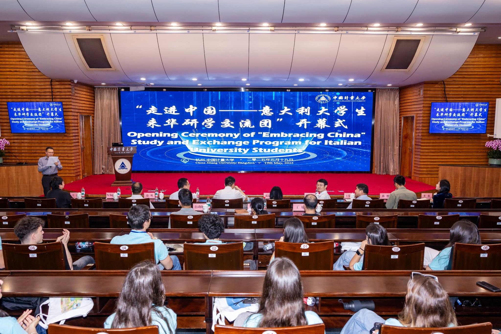5月19日上午,“走進中國——意大利大學生來華研學交流團”開幕式在中國計量大學隆重舉行。80位來自意大利的青年學子齊聚一堂,開啟為期10天的中華文化研學之旅。中國計量大學副校長王斌銳、浙江省教育廳國際處處長藍晶晶等領導出席活動并致辭。