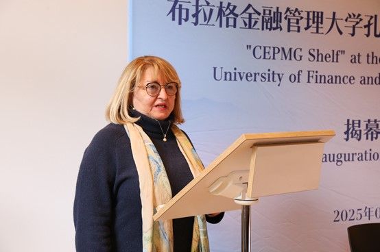 布拉格金融管理大學校長博胡斯拉娃·申基若娃在致辭中感謝中教集團所帶來的優質圖書。她表示,這些圖書將幫助布拉格金融管理大學孔子學院的學生提升中文水平,更深入地了解中國的過去、當下和未來,更全面地感知中國的歷史文化,為將來有機會到中國學習和交流打下良好的基礎。