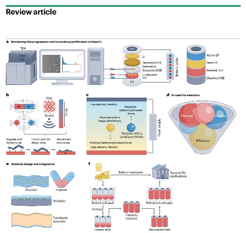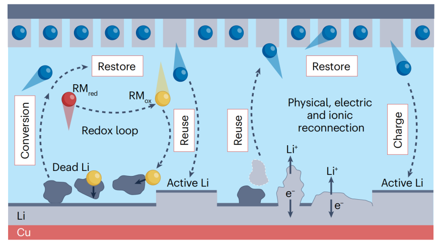 鋰及其他堿金屬電池是極具前景的下一代儲(chǔ)能技術(shù)。然而,此類電池在使用過(guò)程甚至儲(chǔ)存期間,會(huì)因電極材料持續(xù)失活(產(chǎn)生失活或“死”鋰)而導(dǎo)致壽命有限。所謂死鋰,它是電子絕緣的金屬鋰與固體電解質(zhì)界面(SEI)的混合物。大量研究致力于揭示電極材料失活的根源及其緩解策略。鑒于死鋰無(wú)法完全避免,對(duì)其進(jìn)行激活再利用已成為延長(zhǎng)電池和儲(chǔ)能系統(tǒng)壽命的一種解決方案。本文討論了:(1)死鋰的起源及其對(duì)電池運(yùn)行的影響;(2)總結(jié)了與死鋰相關(guān)的新興挑戰(zhàn),如SEI溶解、死鋰遷移、鋰腐蝕和固態(tài)電池死鋰問(wèn)題(3);評(píng)估了當(dāng)前旨在減少死鋰形成的策略的局限性;(4)如何通過(guò)氧化還原化學(xué)和電化學(xué)方法來(lái)恢復(fù)和再生死鋰;(5)探討了激活策略在其他非鋰、大規(guī)模儲(chǔ)能系統(tǒng)中的發(fā)展機(jī)遇。