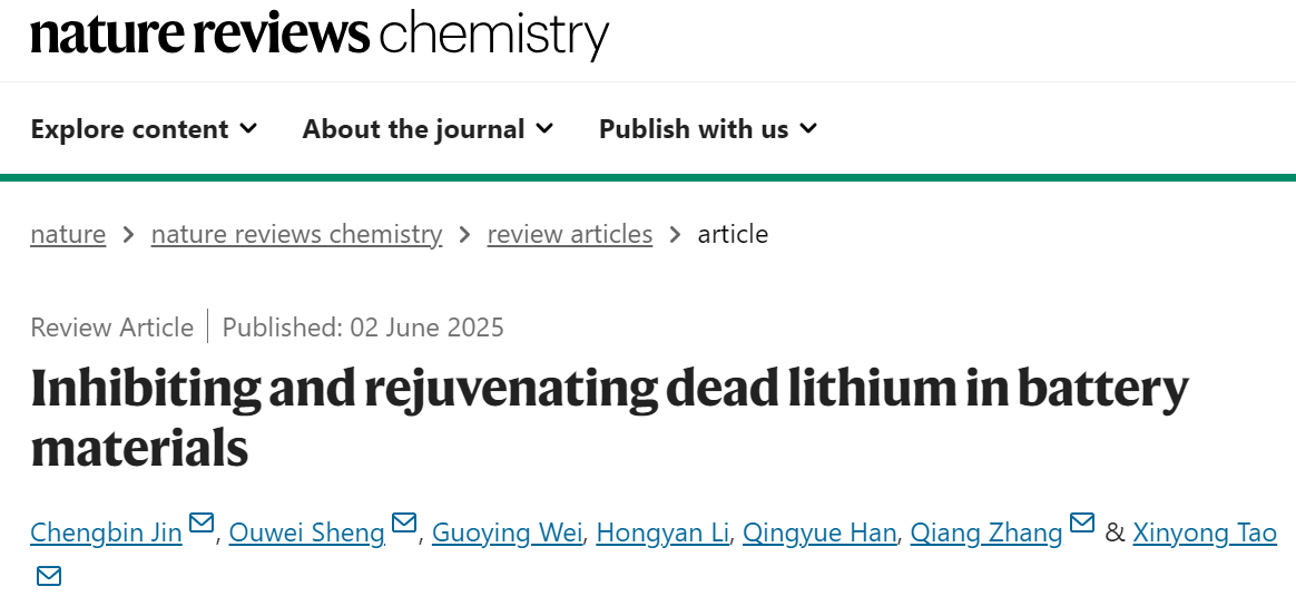 近日,我校材料與化學(xué)學(xué)院金成濱研究員與杭州電子科技大學(xué)盛歐微副研究員,清華大學(xué)張強(qiáng)教授及浙江工業(yè)大學(xué)陶新永教授在Nature Reviews Chemistry上發(fā)表題為“Inhibiting and rejuvenating dead lithium in battery materials”的綜述論文,對(duì)電池材料失效與激活進(jìn)行了評(píng)論和展望。中國(guó)計(jì)量大學(xué)為第一通訊單位。