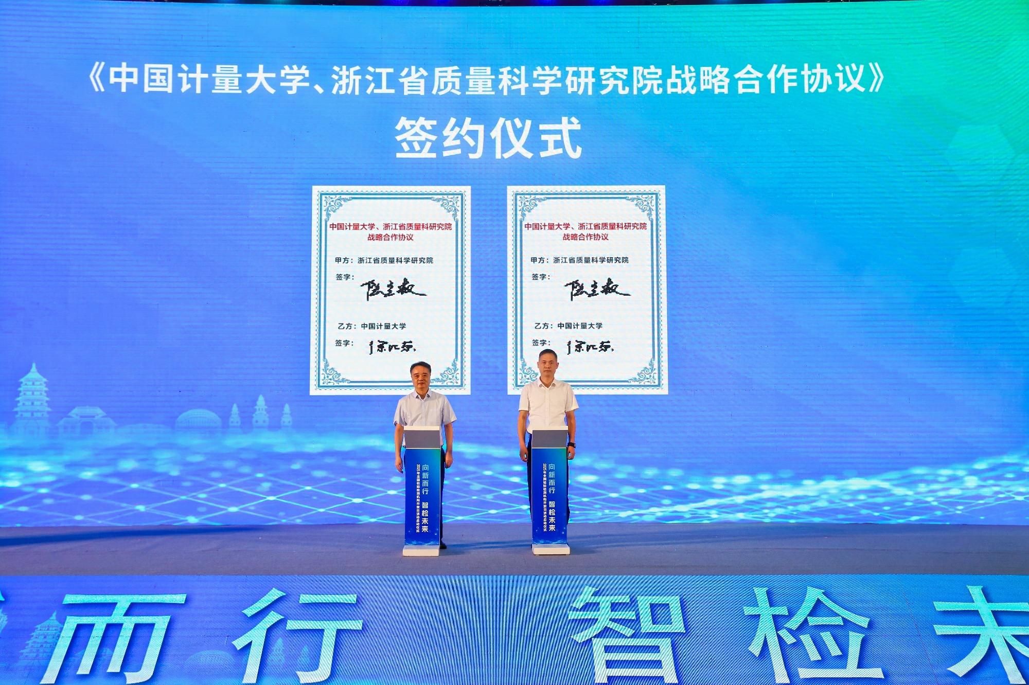 在“檢驗檢測開放共享簽約儀式”環節,徐江榮與浙江省市場監督管理局黨委委員、浙江省質量科學研究院黨委書記、院長陸立權共同簽署了《中國計量大學 浙江省質量科學研究院 戰略合作框架協議》,旨在推動檢驗檢測資源的開放共享,加強校地合作,促進科技成果轉化與創新能力提升,共同服務國家質量基礎設施建設和現代化產業體系發展。
