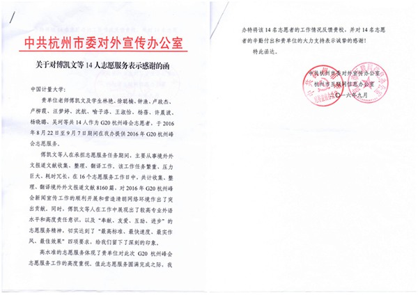 “我志愿服務2016年G20杭州峰會。踐行志愿服務宗旨,弘揚志愿服務精神,牢記使命、不負重托、真情奉獻、為國爭光,用服務演繹別樣精彩,用行動確保‘四個滿意’”。我校小青荷們在服務期間牢記誓詞,發揚吃虧耐勞、認真負責、細致專業的精神,在各個服務崗位上用標準化和高質量的服務,得到了各國外賓、用人單位和崗位負責人等的一致贊許,并于服務結束后送上紀念品和感謝信。同時,多名小青荷也受到了浙江電視臺、中國教育報、錢江晚報、浙江在線等多家媒體的采訪和報道。