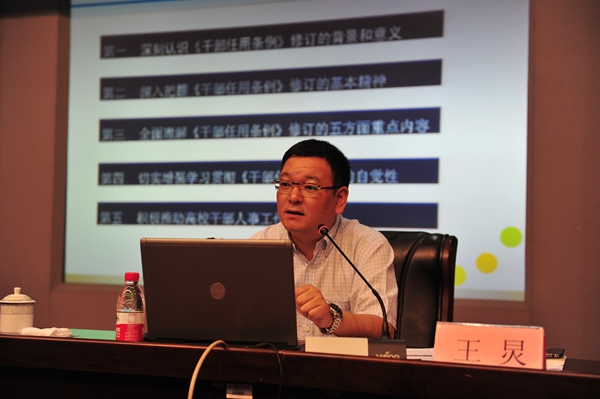 9月6日上午,省委組織部干部三處處長王炅通過解讀《干部選拔任用工作條例》,對高校干部隊伍建設進行了專題講座。在報告中,王炅指出高校應重視干部隊伍和人才隊伍建設,認真貫徹落實黨管干部、黨管人才的原則,努力探索新形勢下干部隊伍建設和人才隊伍建設的規律,發揮黨組織的領導和把關作用,從嚴管理干部,推動高校干部人事工作上新水平,帶動學校各項事業蓬勃發展。他強調,在高校干部隊伍建設中應堅持好干部的標準,拓寬選人用人的視野和渠道,以獅子型干部為重點選好配強高校領導干部,以增強領導班子整體功能為重點建設好班子,以增強后備干部隊伍建設為重點培養好梯隊。