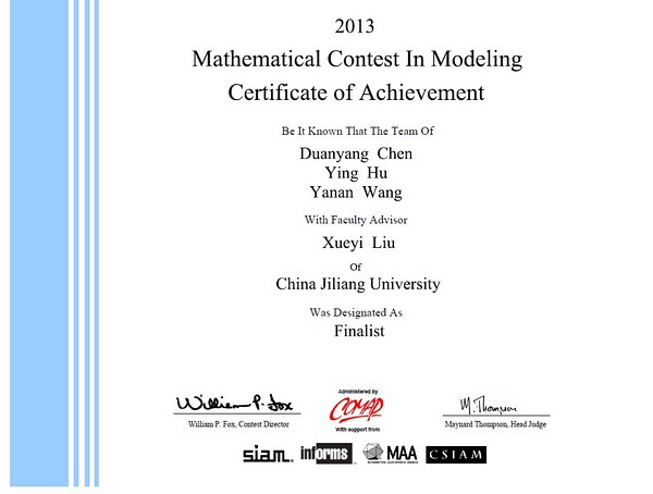 2013年國際大學生數學建模競賽(含交叉學科競賽,MCM&ICM)結果日前揭曉,我校組織的19支參賽隊在本次比賽中獲得提名特等獎1項(Finalist)、國際一等獎6項(Meritorious)、國際二等獎7項(Honorable Mention)的優異成績,總成績位居浙江省屬高校之首。今年共有來自美國、加拿大、英國、德國、中國等14個國家和地區的6593支隊伍參與了本次賽事各種獎項的角逐。其中全球僅有36支隊伍獲得特等獎和提名特等獎,不到參賽隊總數的0.6%。