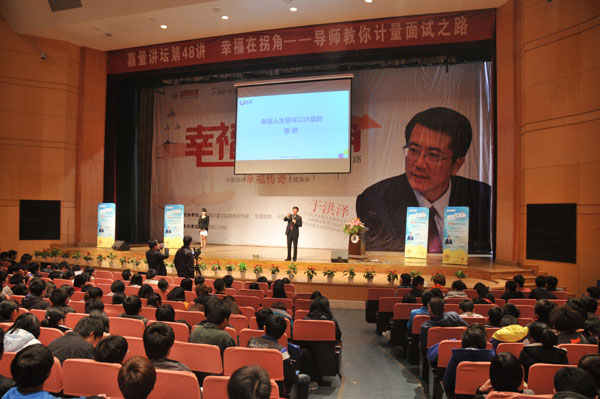 講座中,于洪澤首先分析了大家普遍存在的看待生活的誤區,并從新視野、新思路和新方法這三個角度出發,向同學們闡述了什么是幸福以及他對幸福的理解。他告訴同學們,幸福是心理欲望得到滿足時的狀態,是一種持續時間較長的對生活的滿足和感到生活有巨大樂趣并自然而然地希望持續久遠的愉快心情。幸福是每個人自己定義的,這是人們的權利,也是人們的義務和責任。所謂新方法,于洪澤希望同學們掌握獨立思考的本領,用自己的理論和知識體系解讀社會,不斷優化自己的能力,從而走到幸福的拐角。于洪澤在講座中通過大量生動的案例告訴同學們,要理性面對就業形勢,平衡心態,學會自己經營自己的人生;要早日規劃自己的職業生涯,積極參加社會實踐,增強解決實際問題的能力,不斷積累各方面的經驗,使自己更好地適應社會。