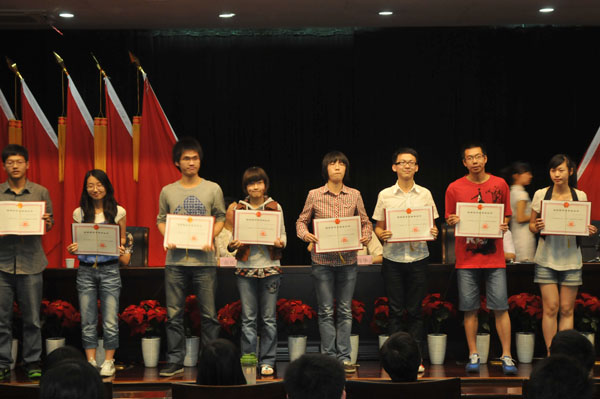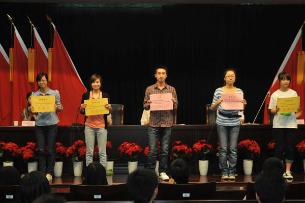 5月27日,我校在聞廳二樓小報告廳隆重召開2010年學生表彰大會,對榮獲2010年校級以上學科競賽、2009—2010學年國家獎學金、2010年國家專利、2010年浙江省大學生舞蹈節、浙江省十佳學生社團、浙江省優秀學生社團獎勵的同學進行了表彰。校黨委副書記陶偉華、副校長宋明順出席了大會,有關職能部門負責人,各二級學院分管學科競賽領導、指導教師、受表彰學生、參加2011年A類學科競賽集訓同學以及各學院學生代表參加了大會。大會由教務處處長潘嵐主持。