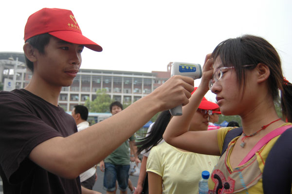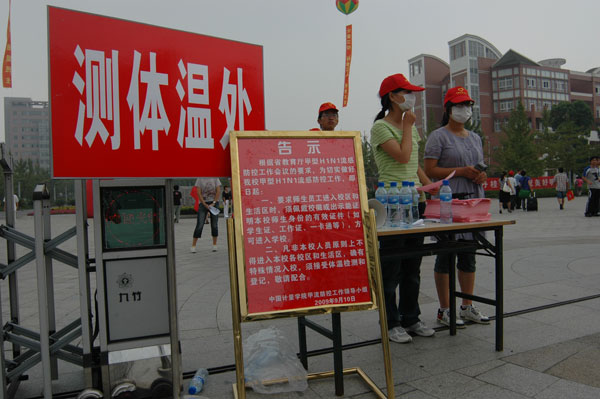 由于近日杭城甲型H1N1流感防控形勢嚴峻,受此影響,新生報到第一天,學校的老師、保安、醫務人員全部嚴陣以待。全校迎新工作人員須自行測量體溫,檢測正常后方可參加迎新接待工作。