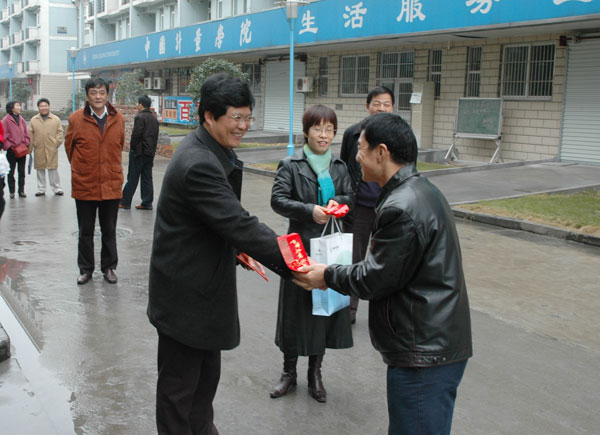 2月17日上午,杭城氣溫驟降,春意料峭。校黨委副書記徐涌金、副校長張碩年在相關(guān)職能部門負責人、部分二級學(xué)院領(lǐng)導(dǎo)的陪同下看望了寒假留校的師生員工。他們深入學(xué)生公寓,噓寒問暖,向留守在學(xué)校的師生員工送上了新年的禮物。   據(jù)悉,寒假期間我校有近300名學(xué)生仍留在學(xué)校,為了確保假期校園及留校學(xué)生的安全,使這些學(xué)生能過個開心年,保衛(wèi)處、后勤服務(wù)公司等部門做了大量的工作,許多人員放棄了休息時間,堅守在工作崗位上。   中午11:00,學(xué)校領(lǐng)導(dǎo)來到了學(xué)生食堂,看望留校學(xué)生。今天在食堂用餐的同學(xué)每人不僅拿到了我校后勤服務(wù)公司為每人準備的新年大禮包,還受到了學(xué)校領(lǐng)導(dǎo)的親自關(guān)懷,喜悅之情溢于言表。他們紛紛表示學(xué)校就是自己的家,在學(xué)校過農(nóng)歷年和在家一樣感到溫馨和幸福。