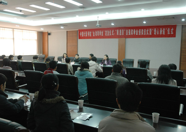 2006年1月9日下午4:20,我校在聞聽一樓會議室舉行“金秋助學金”發放儀式、“康恩貝” 殘疾人大學生自強獎學金頒獎儀式暨“愛心承諾”儀式。杭州經濟技術開發區慈善總會秘書長滕鳳虎、校黨委副書記徐涌金、學生處處長范慶瑜出席了儀式。   會議首由滕鳳虎秘書長介紹了“金秋助學金”的總體情況。他說,杭州經濟技術開發區慈善總會于2004年12月成立以來,不斷接受來自企業、學校、個人的捐助,這些善款都用于資助開發區內的家庭經濟困難的大、中、小學生及困難群眾。截至目前,已有1500余名學生和困難群眾得到了資助。開發區慈善總會在今后會一如既往的關注經濟困難的大學生,幫助他們順利完成學業。他同時宣布了我校2006年獲得“金秋助學金”的學生名單。   校學生處處長范慶瑜宣布了“康恩貝”殘疾人大學生自強獎學金獲獎學生名單。   接著,滕鳳虎秘書長和徐涌金副書記為獲助學生發放了助學金,為獲獎學生頒發了獎學金。   管理學院04財管4班鄭光輝同學代表獲助、獲獎同學在會上發言。她表示,感謝國家、府、社會各界和學校對困難學生的關愛,今后將繼續努力,勤奮學習,刻苦完成學業,爭取以優秀的成績回報母校,回報社會,報效祖國。   獲助和獲獎學生還現場舉行了“愛心承諾”儀式,承諾在踏入社會、事業有成時對母校的困難生進行資助。   最后,徐涌金副書記做了重要講話。他首先代表學校對杭州經濟技術開發區慈善總會對我校困難生的無私捐助表示感謝。同時,他還對困難學生提出要求,希望家庭經濟困難學生刻苦學習,以優異的成績來回報捐助者, 成為社會的有用之材。