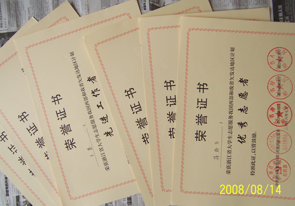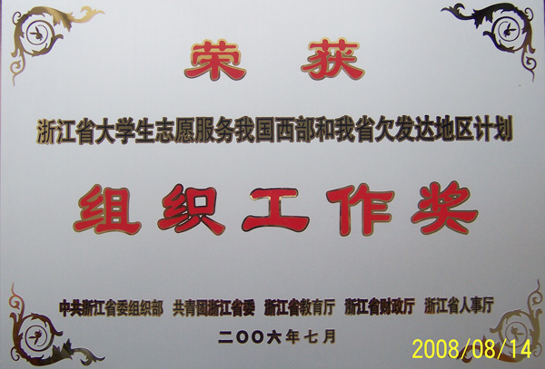 在近日剛剛結(jié)束的浙江省大學(xué)生志愿服務(wù)我國(guó)西部和我省欠發(fā)達(dá)地區(qū)工作的各項(xiàng)評(píng)比中,我校由于措施到位、成效顯著,志愿者在服務(wù)地工作表現(xiàn)突出,受到省委組織部、團(tuán)省委、省教育廳等單位的聯(lián)合表彰,校“兩項(xiàng)計(jì)劃”項(xiàng)目辦榮獲“兩項(xiàng)計(jì)劃”優(yōu)秀組織工作獎(jiǎng),校團(tuán)委王慧同志榮獲“‘兩項(xiàng)計(jì)劃’先進(jìn)工作者”榮譽(yù)稱(chēng)號(hào),潘丹、王健、李國(guó)棟、楊如心、蔣經(jīng)飛等五位同學(xué)榮獲“‘兩項(xiàng)計(jì)劃’優(yōu)秀志愿者”榮譽(yù)稱(chēng)號(hào)。