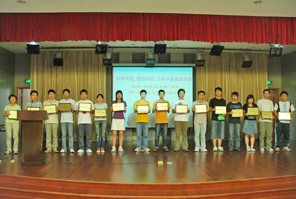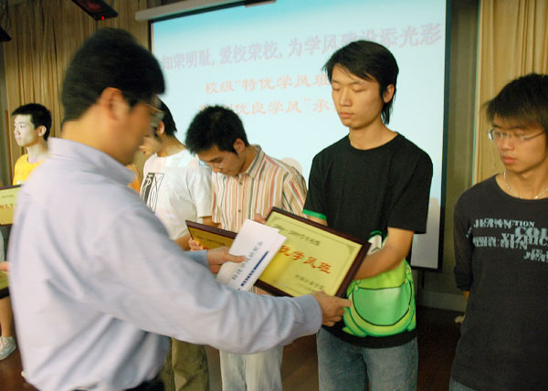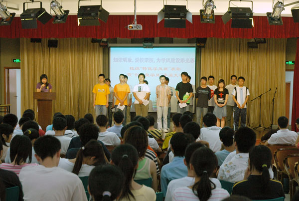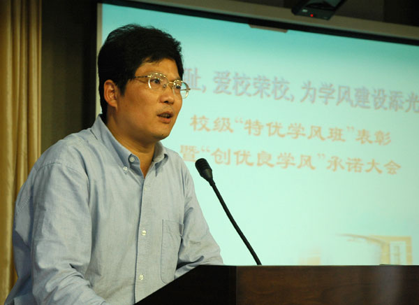 今年是我校本科教學“迎評創優”年,為了營造良好的學風、創建優良的校風,校黨委學工部在全校開展了“知榮明恥,愛校榮校,為學風建設添光彩”為主體的學風建設活動。6月2日晚6:00,我校在方圓南樓五樓多功能廳舉行知榮明恥,愛校榮校,為學風建設添光彩——校級“特優學風班”表彰暨“創優良學風”承諾大會。學校黨委副書記徐涌金、各二級學院分管學生工作黨總支書記、輔導員、全校各班級學生代表參加了大會。大會由學生處處長金國雄主持。   大會首先由校學風建設領導小組成員量新學院黨總支書記巢岺老師宣布《關于表彰2004-2005學年校級特優學風班的決定》,徐涌金副書記為特優學風班頒發獎牌和獎金。   接著,校特優學風班學生代表特優學風班全體同學向全校師生做出了“知榮明恥,愛校榮校,為學風建設添光彩”的學風建設承諾,承諾從小事做起、從點滴做起,自覺遵守校級校規,嚴格遵守《中國計量學院學生課堂規范》。   校特優學風班代表還向全校同學發出了學風建設倡議,倡議全校同學“從現在做起,從自己做起,從嚴要求,營造良好學風,創建文明校風,以飽滿的熱情和積極向上的精神風貌迎接教育部本科教學評估”。獲得2004-2005學年校級“優良學風班”的班級學生代表做出了響應學風建設倡議的發言。   最后,校黨委副書記徐涌金在大會上發表講話。徐書記指出,學校長期以來一直高度重視學風建設工作,不斷探索學風建設的有效途徑,積累了很多好的經驗。學風建設對于學校的發展和學生個人的發展都起到了重要的作用。首先,學校和學生都要對學風建設引起高度重視。對學校來說,學風建設是學校培養高層合格人才的需要,是創建國內知名的教學研究型大學的需要,也是學校迎評創優的需要;對學生來說,學風建設是學生順利完成學業的需要,是增強學生綜合素質的需要,也是學生健康成長成材的需要。因此,今天的大會既是一個校級特優學風班的表彰大會,也是一個創優良學風的承諾大會,更是一個以評促建、評建結合、重在建設,以實際行動加強學風建設,迎接教育部本科教學工作水平的誓師大會。其次,學校和學生都要主動參與學風建設、加強學風建設。學校要對全校學生加強引導,從入學教育著眼、從制度機制著力、從班風寢風著手,致力于形成學風建設的良性循環;廣大學生要從自己做起、從點點滴滴做起,共同營造良好的學習風氣。最后,他希望全校學生能以“知榮明恥、愛校榮校”為己任,在教育部對我校的本科教學評估中起到更好的作用。