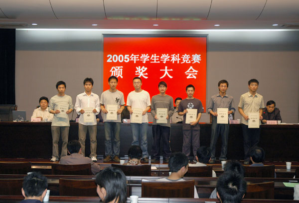 2006年4月29日下午,學(xué)校在小報(bào)告廳二樓會議室隆重舉行了2005年度學(xué)生學(xué)科競賽表彰大會。出席這次大會的有徐涌金副書記、侯宇副校長、學(xué)生處處長金國雄、團(tuán)委書記巢岺、教務(wù)處處長易榮華、教務(wù)處副處長潘嵐、學(xué)科競賽指導(dǎo)教師和參賽學(xué)生。會議由易榮華主持。   會議首先由易榮華宣布獲獎學(xué)生和指導(dǎo)教師名單(不含“挑戰(zhàn)杯”),并由校領(lǐng)導(dǎo)向獲省級以上獎項(xiàng)的學(xué)生和獲得學(xué)科競賽組織獎的學(xué)院頒獎。2005年度我校在全國大學(xué)生數(shù)學(xué)建模競賽、全國大學(xué)生電子設(shè)計(jì)競賽、第二屆浙江省大學(xué)生機(jī)械設(shè)計(jì)競賽、浙江大學(xué)“海特杯”第十屆大學(xué)生機(jī)械設(shè)計(jì)競賽、“舜禹杯”第二屆浙江省大學(xué)生程序設(shè)計(jì)競賽、第四屆浙江省大學(xué)生多媒體作品設(shè)計(jì)競賽、“博創(chuàng)杯”全國大學(xué)生嵌入式系統(tǒng)應(yīng)用設(shè)計(jì)競賽、“CCTV杯”英語演講比賽、第八屆省高校管理案例分析大賽等多項(xiàng)省級競賽中取得好成績。接著指導(dǎo)教師代表數(shù)學(xué)建模組何滿喜老師和獲獎學(xué)生代表李福潮發(fā)言交流了參賽經(jīng)驗(yàn)。   最后侯宇副校長講話,他在講話中充分肯定了我校在2005年學(xué)科競賽中取得的突出成績,并且對做好今后的學(xué)科競賽工作提出了殷切的期望和具體要求,希望有關(guān)單位領(lǐng)導(dǎo)、各位老師同學(xué)以實(shí)際行動支持、關(guān)心、參與到學(xué)科競賽活動中來,力爭2006年學(xué)科競賽實(shí)現(xiàn)新的突破,為迎評促建作出新的貢獻(xiàn)。