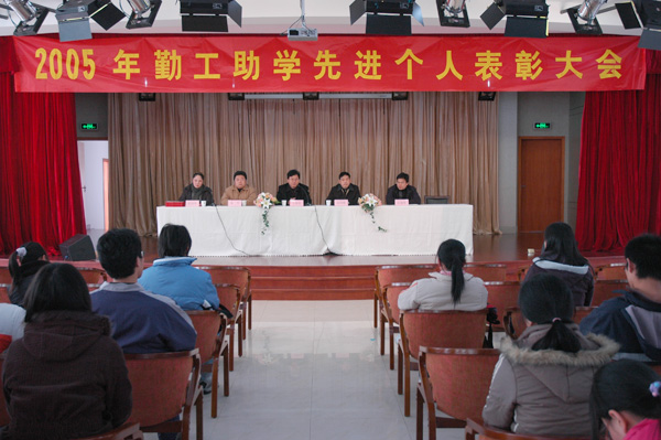 為了鼓勵參與后勤物業(yè)勤工助學活動的學生進一步做好本職工作,表彰在勤工助學過程中成績突出者,2006年1月5日,后勤服務公司2005年度物業(yè)勤工助學先進個人表彰大會在方圓樓多功能廳隆重召開。學生處處長金國雄、后勤服務公司總經(jīng)理王政貴、后勤產(chǎn)業(yè)管理處副處長杜建雄、校團委書記巢老師出席了會議,會議由后勤服務公司副總經(jīng)理范風華主持。   物業(yè)學生勤工助學在我校已有多年的實踐,設(shè)立這樣的勤工助學崗位既是學校領(lǐng)導關(guān)愛困難學生的具體表現(xiàn),也是同學們通過自己的誠信勞動換取報酬完成學業(yè)的途徑之一,多年來,已有一大批的學生獲得了資助,不僅順利完成了學業(yè),同時也在勤工過程鍛煉了自己的才干,業(yè)已成為我校學生三自管理模式的重要組成部分。   會上,學生處處長金國雄通報了學校04—05學年困難生資助的相關(guān)信息。對獲得先進個人的學生表示誠摯的祝賀,對所有在勤工助學崗位上付出辛勤勞動的同學予以高度評價。   公司總經(jīng)理王政貴代表公司向獲得勤工助學先進個人的學生表示祝賀,對同學們在勤工助學過程中對后勤服務工作給予的支持表示感謝,同時真誠的期望同學們珍惜這份工作,相互促進,共同做好服務工作。 來自物業(yè)各個勤工助學崗位的400多名學生了參加會議,物業(yè)勤工助學先進個人獲得者董雪婷在會上發(fā)了言。