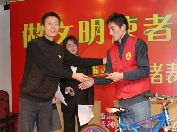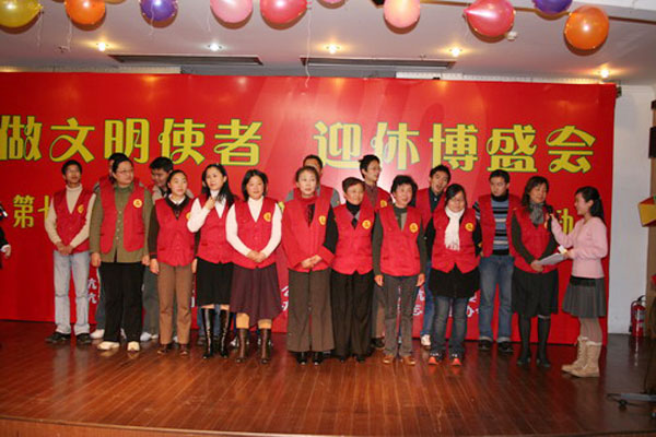 第十二個“國際志愿者日”到來之際,杭州團市委、杭州市青年志愿者協會、西博辦等部門聯合召開了“2005西博會”志愿者工作表彰大會,隆重表彰了在西博會志愿服務行動中做出杰出貢獻的個人和集體,我校青年志愿者總隊被評為第七屆“西博會志愿者行動先進集體”,校青年志愿者總隊隊長申屠汝曦同學獲得“西博會十佳志愿者”榮譽稱號,楊曉蕓等45名同學被評為“西博會優秀青年志愿者”,占獲獎總人數的15%。目前,在歷屆西博會中,我校已有百余名同學獲得先進個人表彰,在杭州各高校中表現突出。